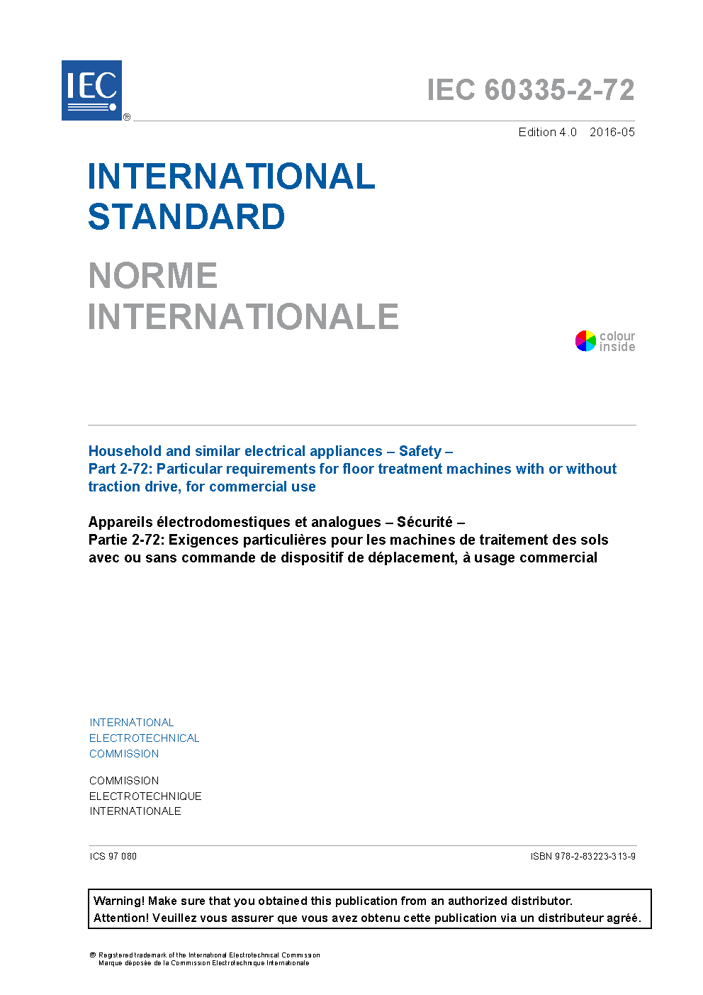 IEC 60335-2-72:2021 Household and similar electrical appliances - Safety - Part 2-72: Particular requirements for floor treatment machines with or without traction drive, for commercial use
