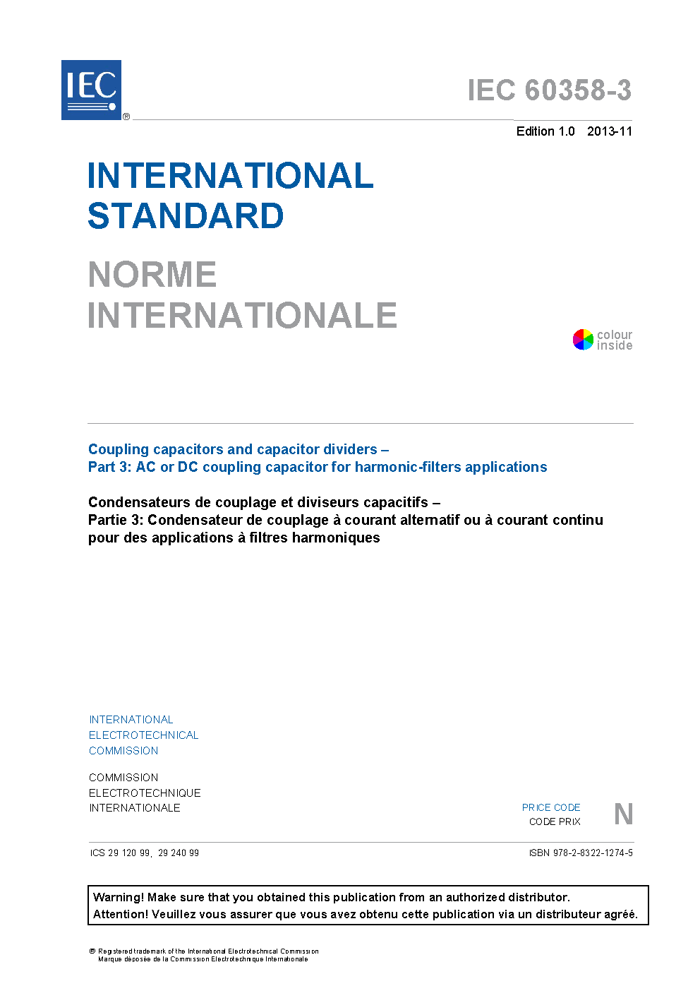 IEC 60358-3:2013 Coupling capacitors and capacitor dividers - Part 3: AC or DC coupling capacitor for harmonic-filters applications