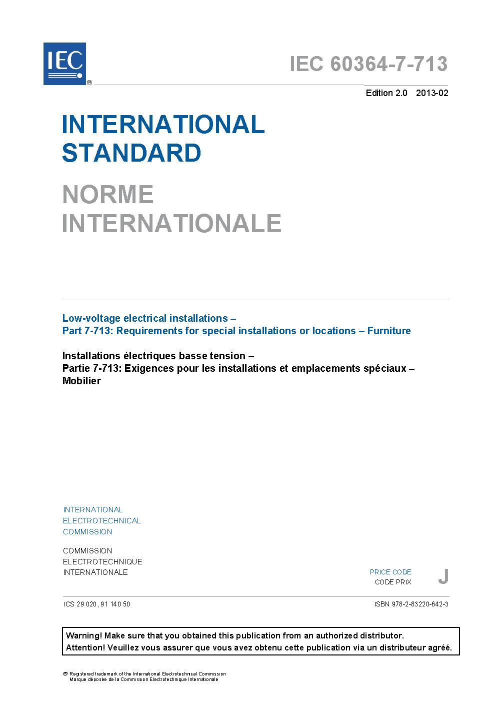 IEC 60364-7-713:2013 Low-voltage electrical installations - Part 7-713: Requirements for special installations or locations - Furniture