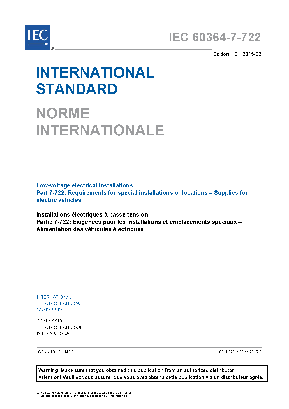 IEC 60364-7-722:2015 Low-voltage electrical installations - Part 7-722: Requirements for special installations or locations - Supplies for electric vehicles