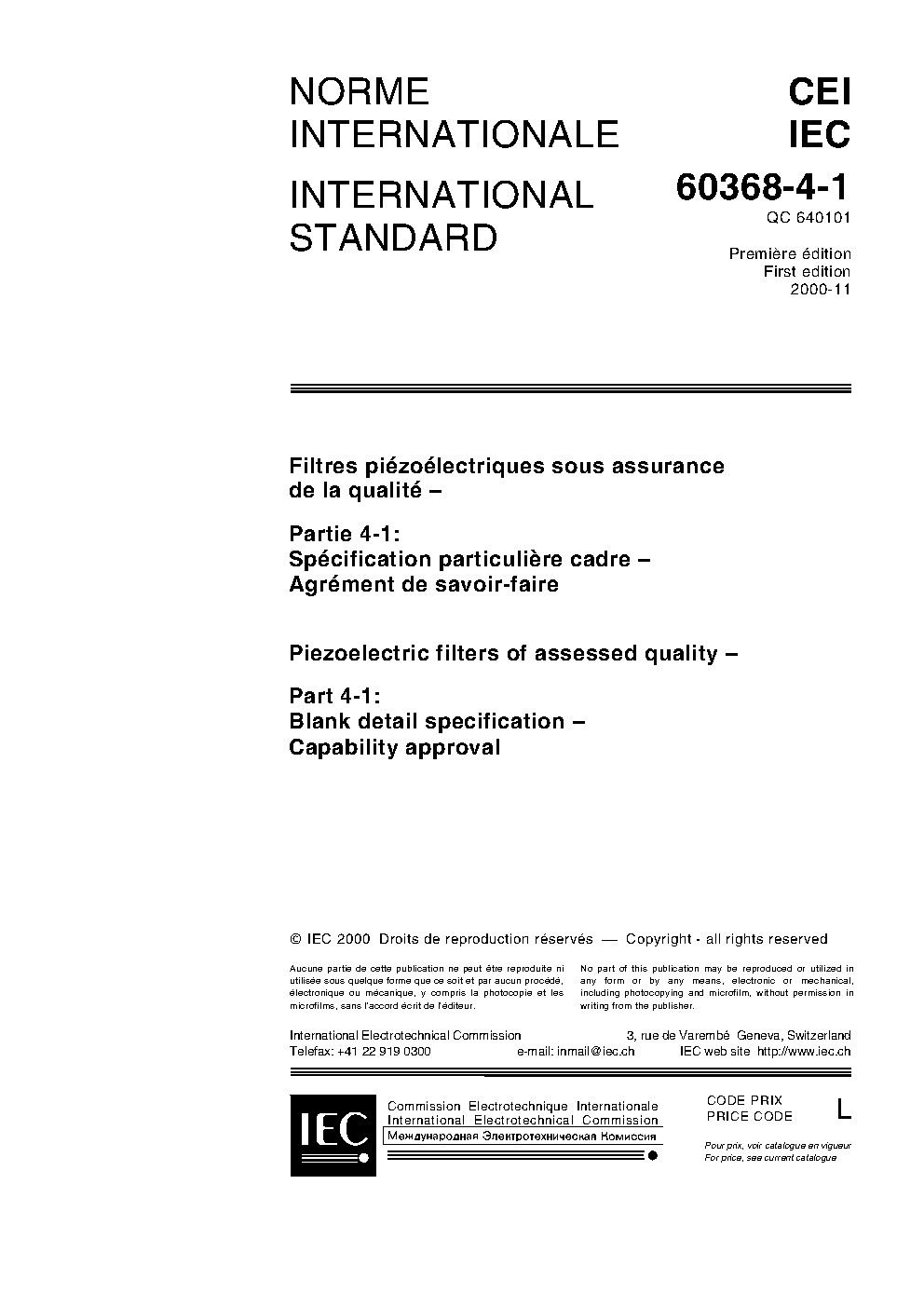 IEC 60368-4-1:2000 Piezoelectric filters of assessed quality - Part 4-1: Blank detail specification - Capability approval