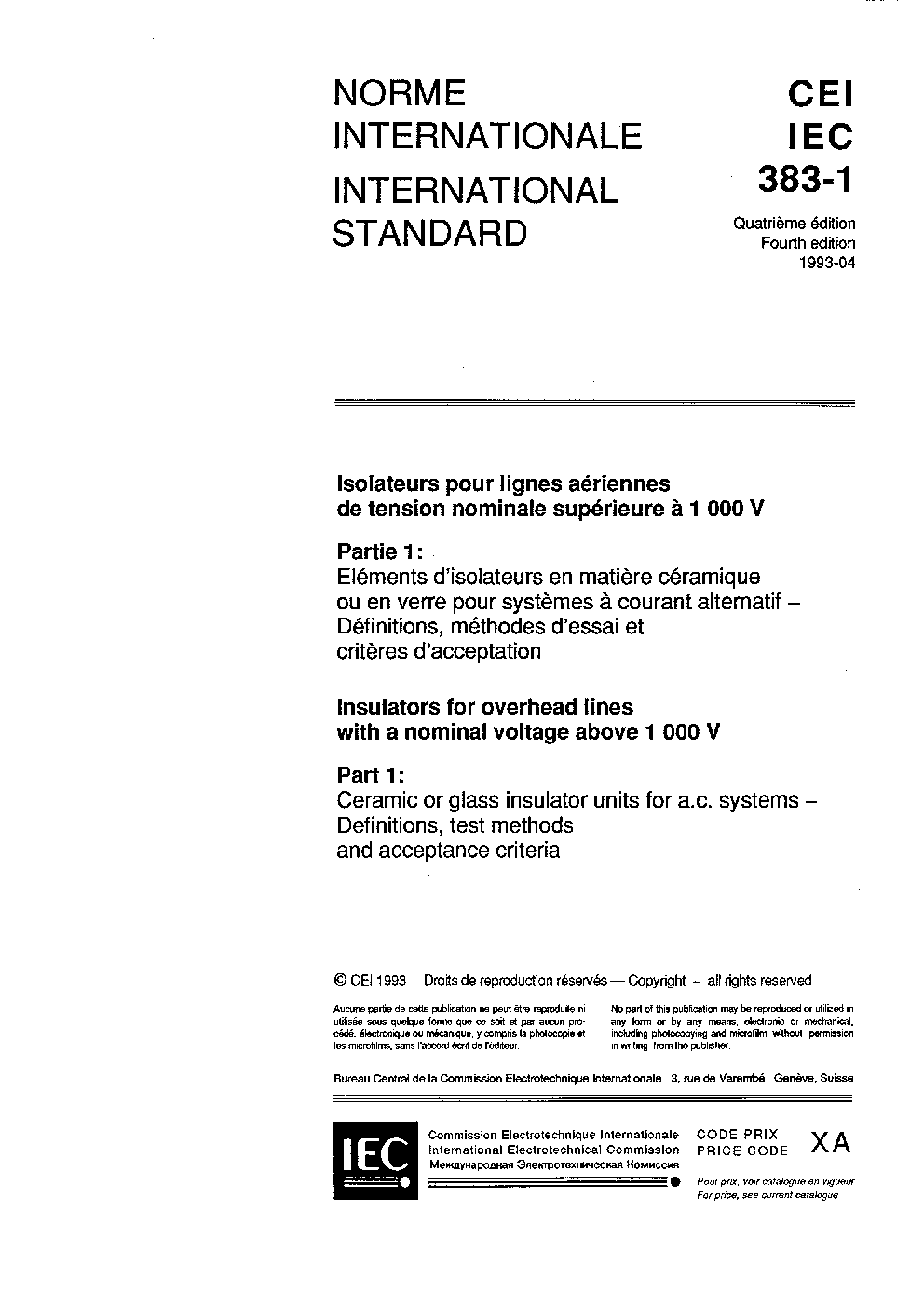 IEC 60383-1:2023 Insulators for overhead lines with a nominal voltage above 1000 V - Part 1: Ceramic or glass insulator units for a.c. systems - Definitions, test methods and acceptance criteria