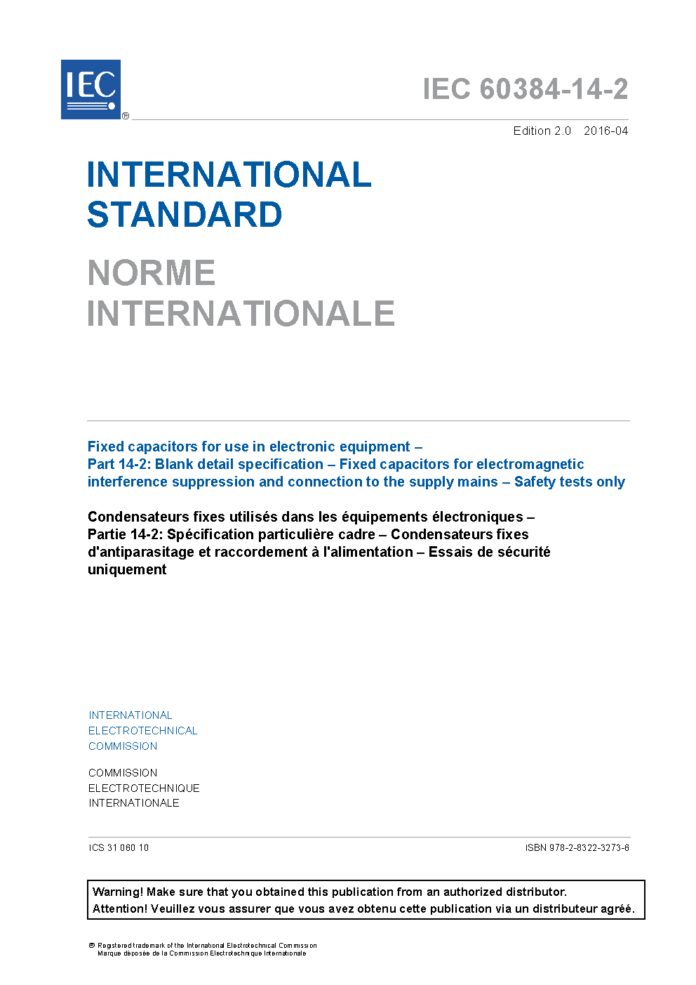 IEC 60384-14-2:2016 Fixed capacitors for use in electronic equipment - Part 14-2: Blank detail specification - Fixed capacitors for electromagnetic interference suppression and connection to the supply mains - Safety tests only
