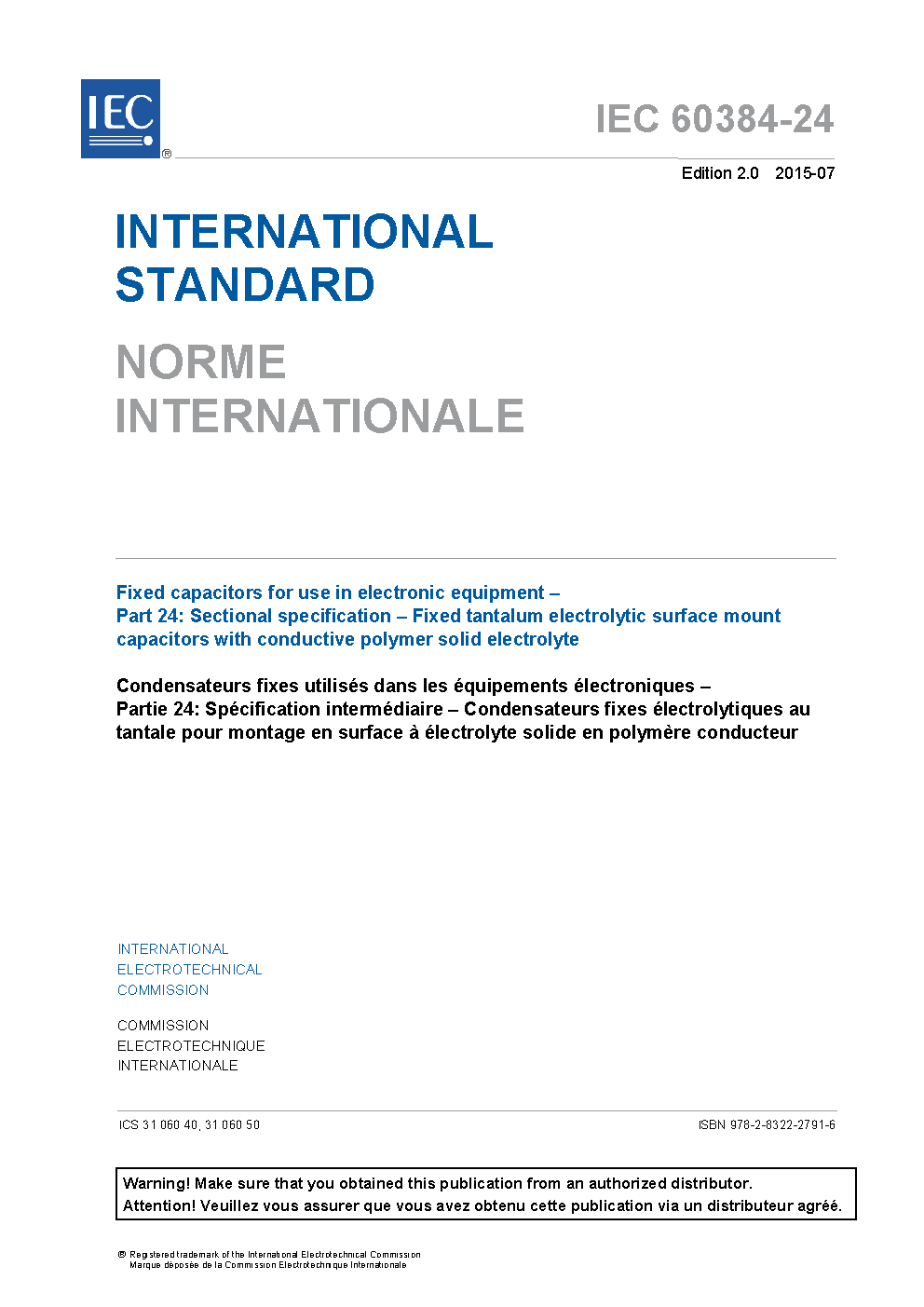 IEC 60384-24:2015/COR1:2016 Corrigendum 1 - Fixed capacitors for use in electronic equipment - Part 24: Sectional specification - Fixed tantalum electrolytic surface mount capacitors with conductive polymer solid electrolyte