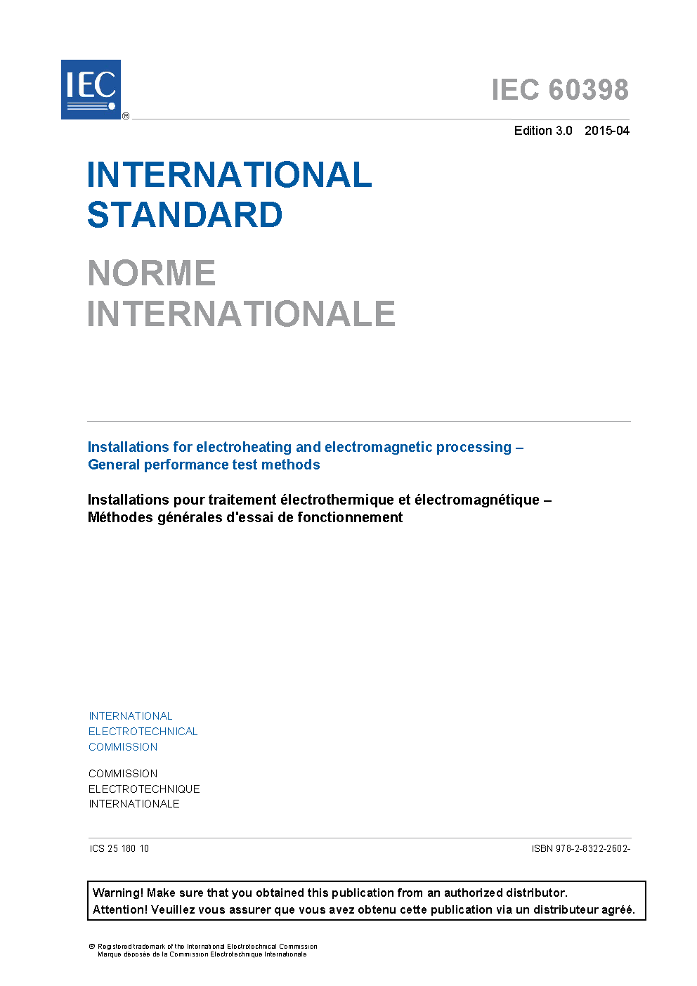 IEC 60398:2015 specifies the basic test procedures, conditions and methods for establishing the main performance parameters and the main operational characteristics of industrial installations and equipment intended for electroheating (EH) or electromagnetic processing of materials (EPM). This third edition cancels and replaces the second edition of IEC 60398 published in 1999 and the first edition of IEC TS 62796 published in 2013. This edition constitutes a technical revision. This edition includes the following significant technical changes with respect to the previous edition: