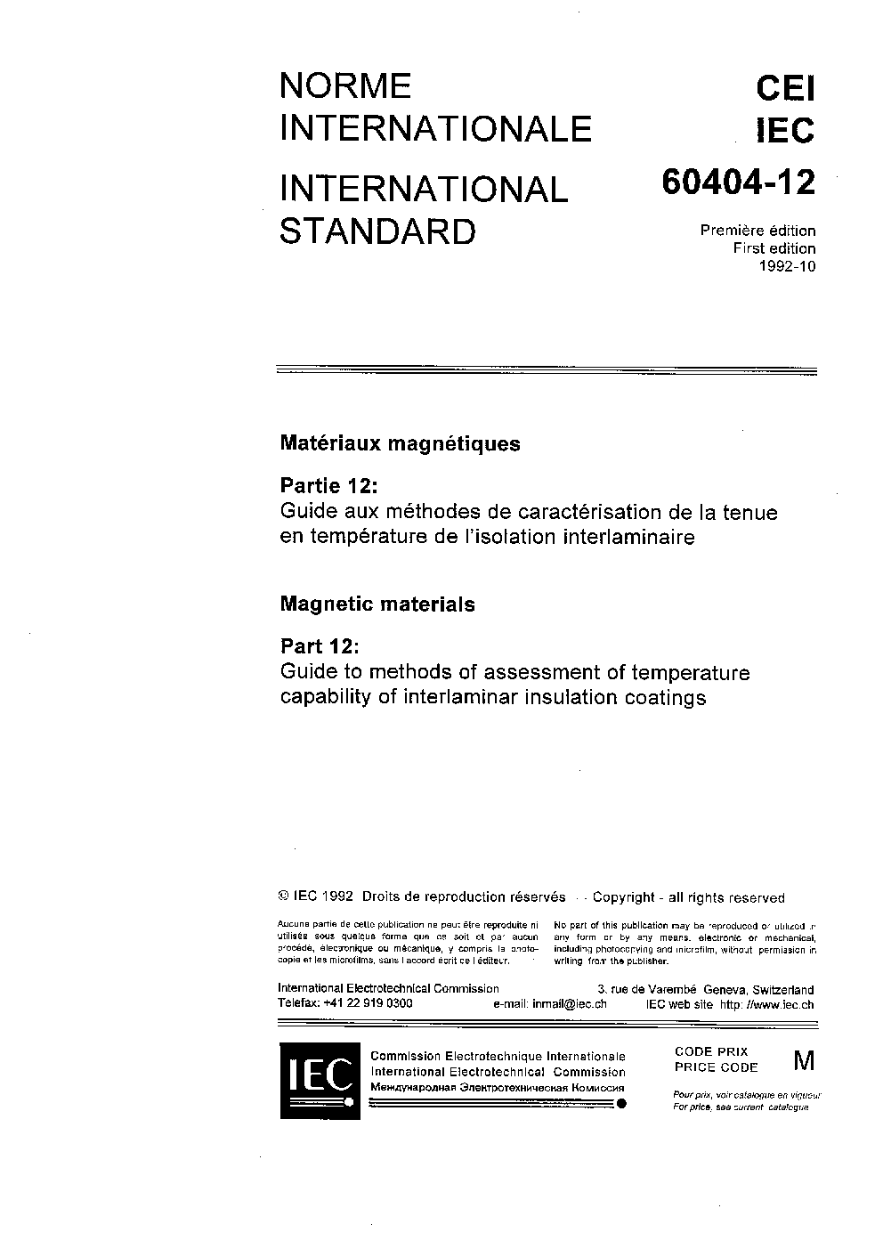 IEC 60404-12:1992 Magnetic materials - Part 12: Guide to methods of assessment of temperature capability of interlaminar insulation coatings