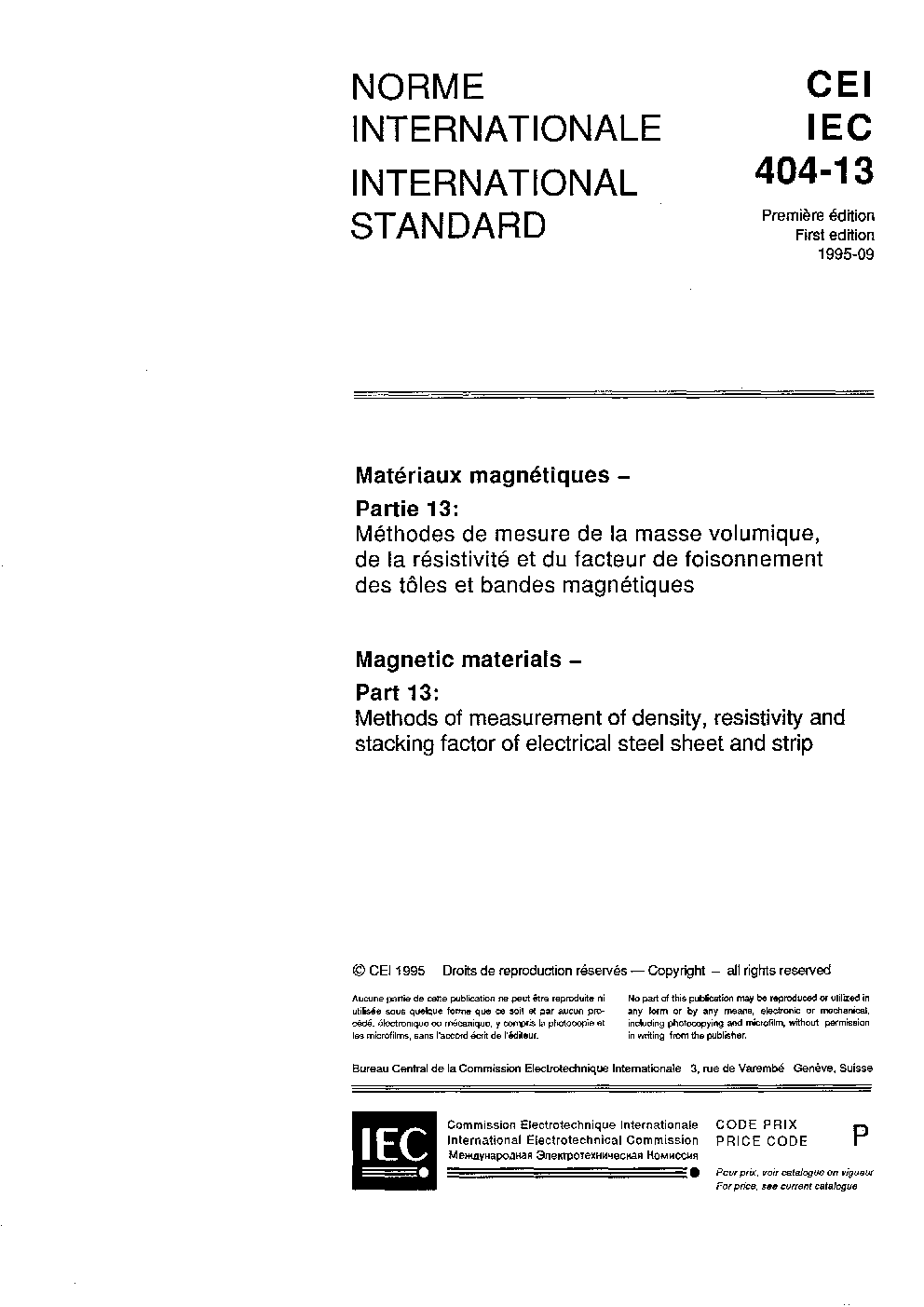 IEC 60404-13:1995 Magnetic materials - Part 13: Methods of measurement of density, resistivity and stacking factor of electrical steel sheet and strip
