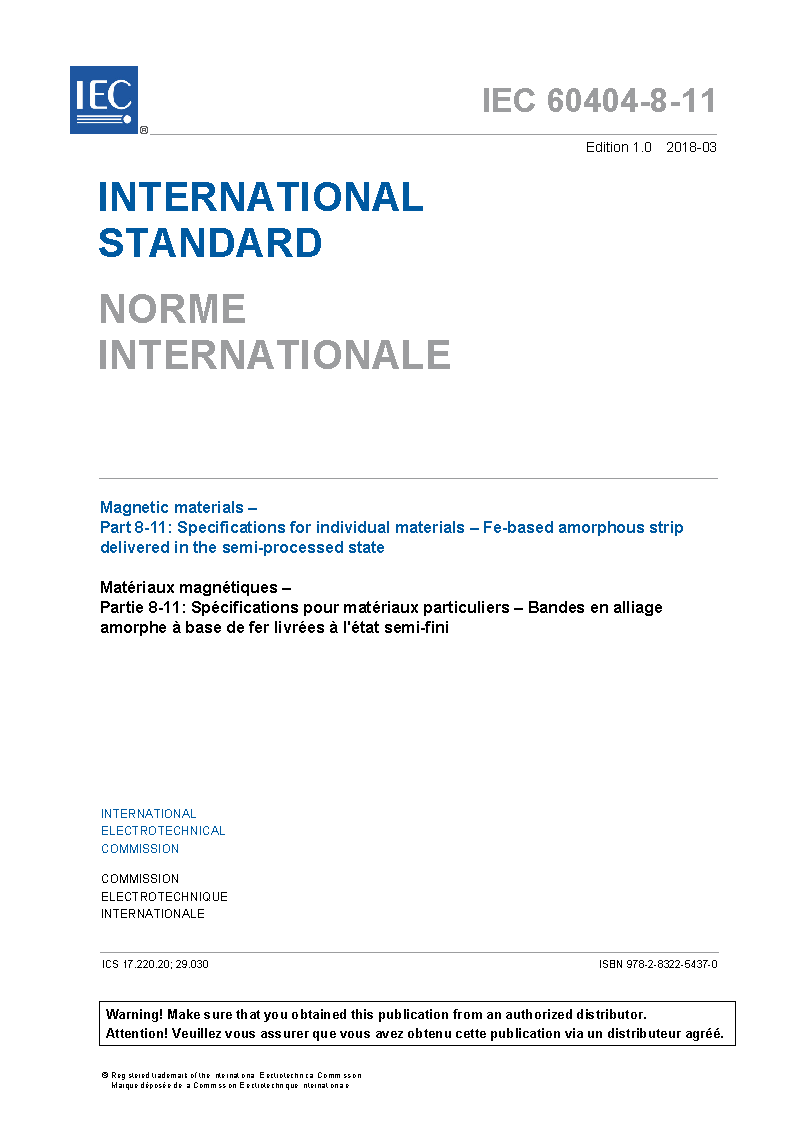 IEC 60404-8-11:2018 Magnetic materials - Part 8-11: Specifications for individual materials - Fe-based amorphous strip delivered in the semi-processed state