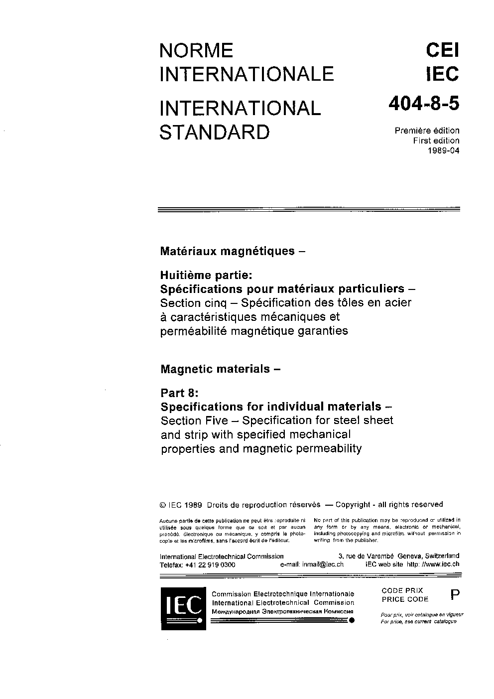 IEC 60404-8-5:1989 Magnetic materials. Part 8: Specifications for individual materials. Section Five: Specification for steel sheet and strip with specified mechanical properties and magnetic permeability