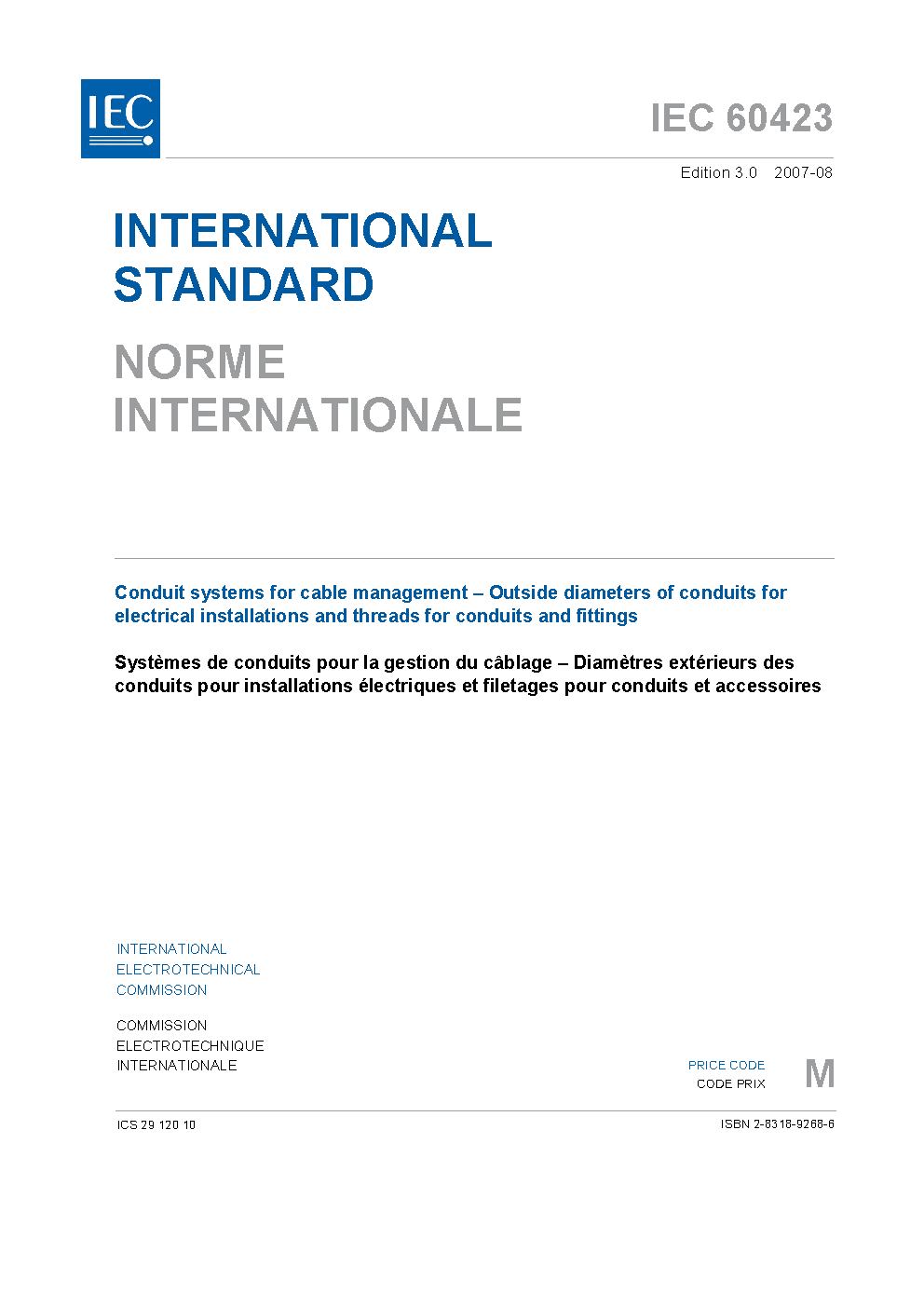 IEC 60423:2007 Conduit systems for cable management - Outside diameters of conduits for electrical installations and threads for conduits and fittings