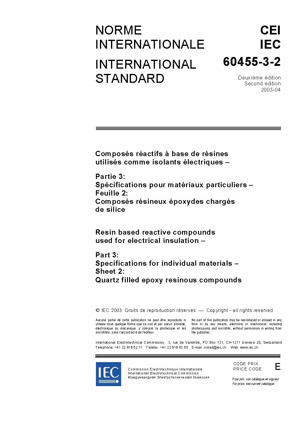 IEC 60455-3-2:2003 Resin based reactive compounds used for electrical insulation - Part 3: Specifications for individual materials - Sheet 2: Quartz filled epoxy resinous compounds