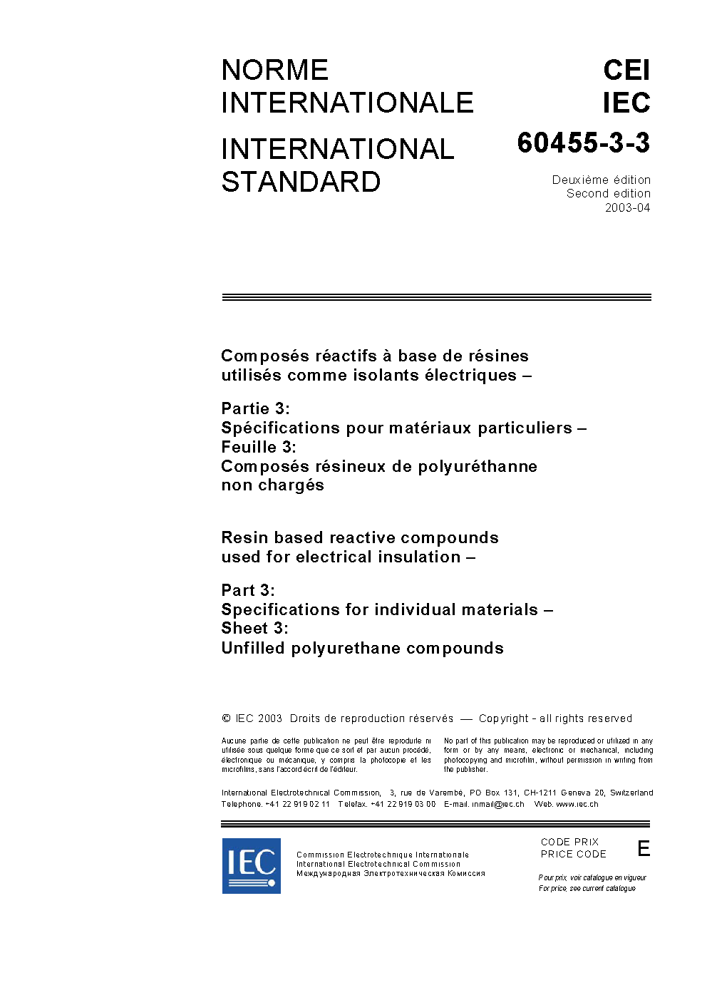 IEC 60455-3-3:2003 Resin based reactive compounds used for electrical insulation - Part 3: Specifications for individual materials - Sheet 3: Unfilled polyurethane compounds