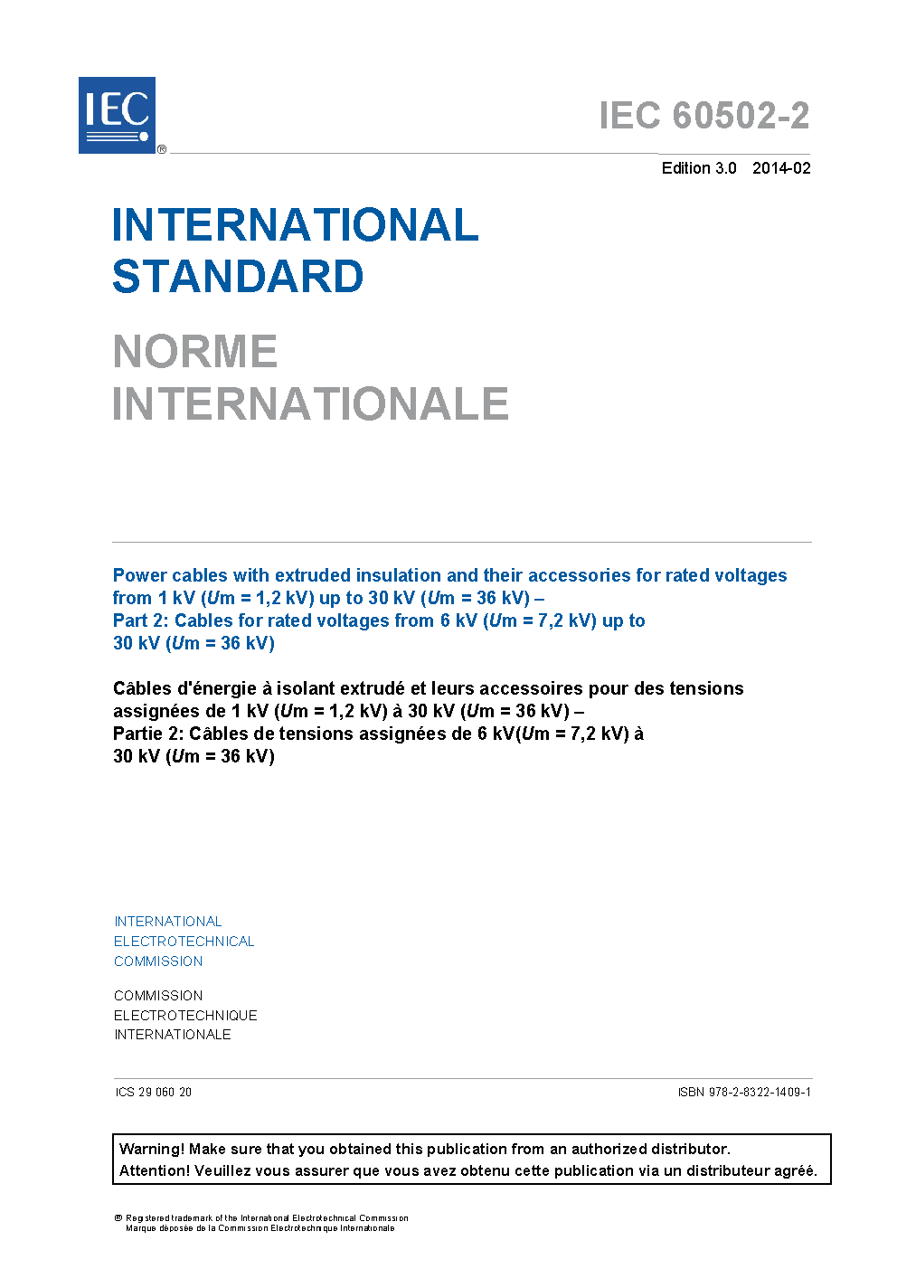 IEC 60502-2:2014 Power cables with extruded insulation and their accessories for rated voltages from 1 kV (Um = 1,2 kV) up to 30 kV (Um = 36 kV) - Part 2: Cables for rated voltages from 6 kV (Um = 7,2 kV) up to 30 kV (Um = 36 kV)