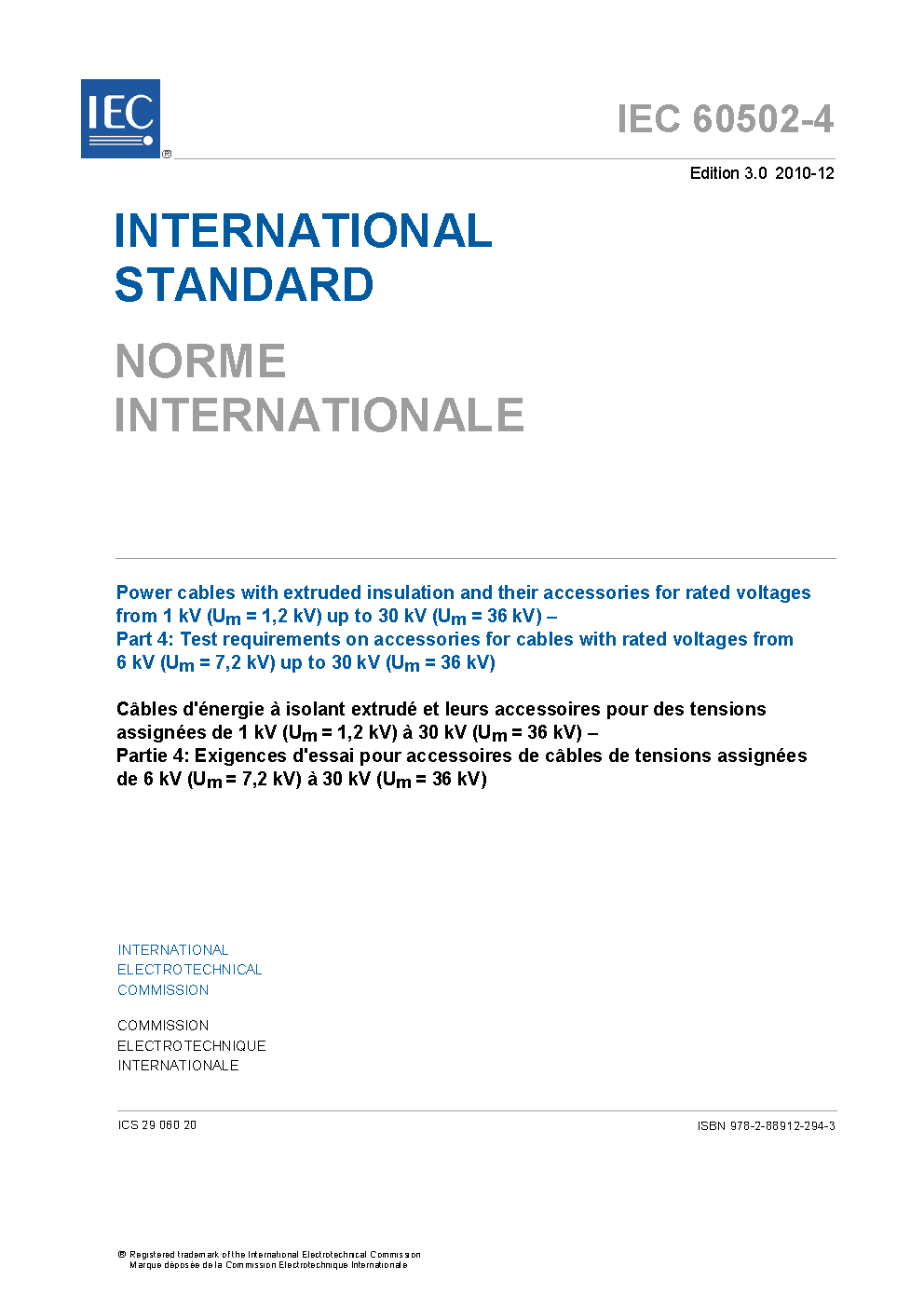 IEC 60502-4:2023 Power cables with extruded insulation and their accessories for rated voltages from 1 kV (Um = 1,2 kV) up to 30 kV (Um = 36 kV) - Part 4: Test requirements on accessories for cables with rated voltages from 6 kV (Um = 7,2 kV) up to 30 kV (Um = 36 kV)