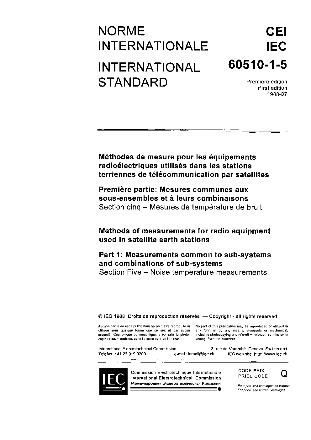 IEC 60510-1-5:1988 Methods of measurement for radio equipment used in satellite earth stations. Part 1: Measurements common to sub-systems and combinations of sub-systems. Section Five: Noise temperature measurements