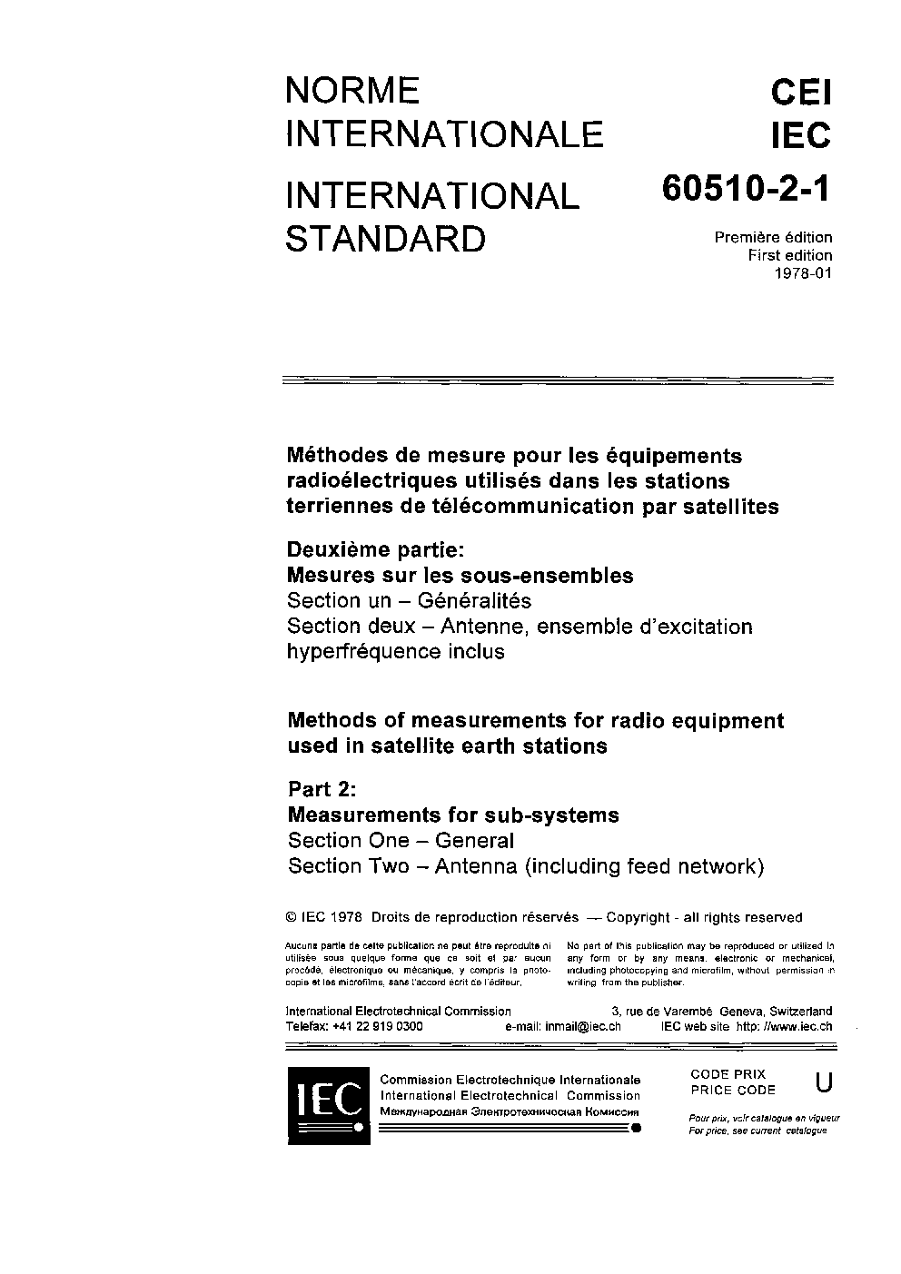 IEC 60510-2-1:1978 Methods of measurement for radio equipment used in satellite earth stations. Part 2: Measurements for sub-systems. Section One: General - Section Two: Antenna (including feed network)