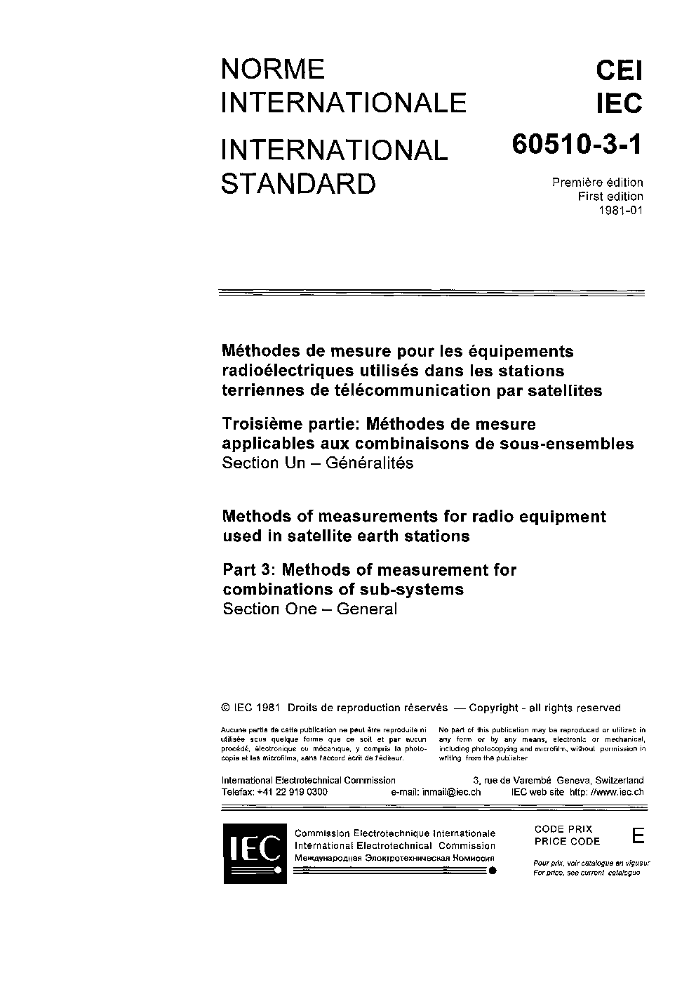 IEC 60510-3-1:1981 Methods of measurement for radio equipment used in satellite earth stations. Part 3: Methods of measurement on combinations of sub-systems. Section One: General