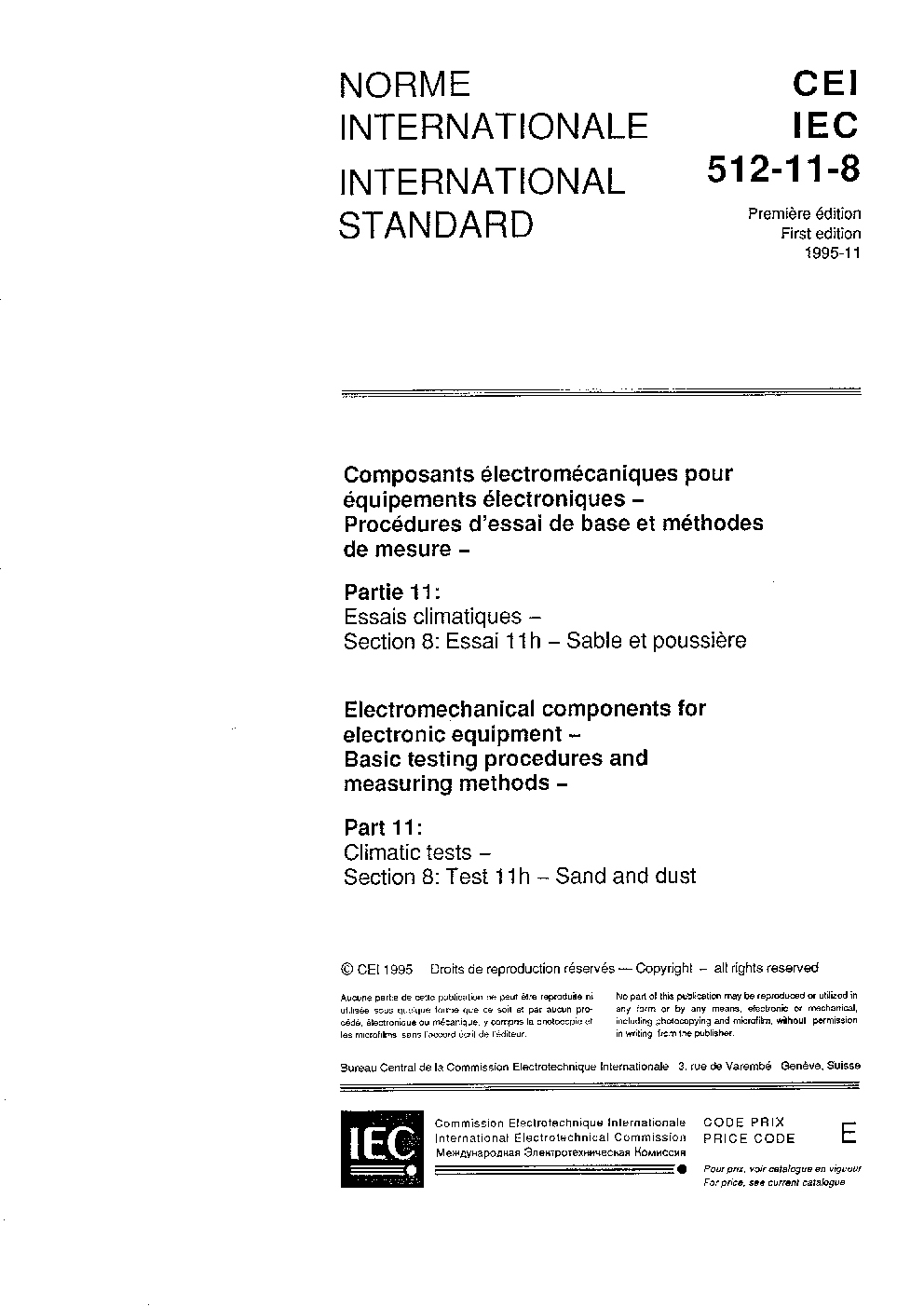IEC 60512-11-8:1995 Electromechanical components for electronic equipment - Basic testing procedures and measuring methods - Part 11: Climatic tests - Section 8: Test 11h - Sand and dust