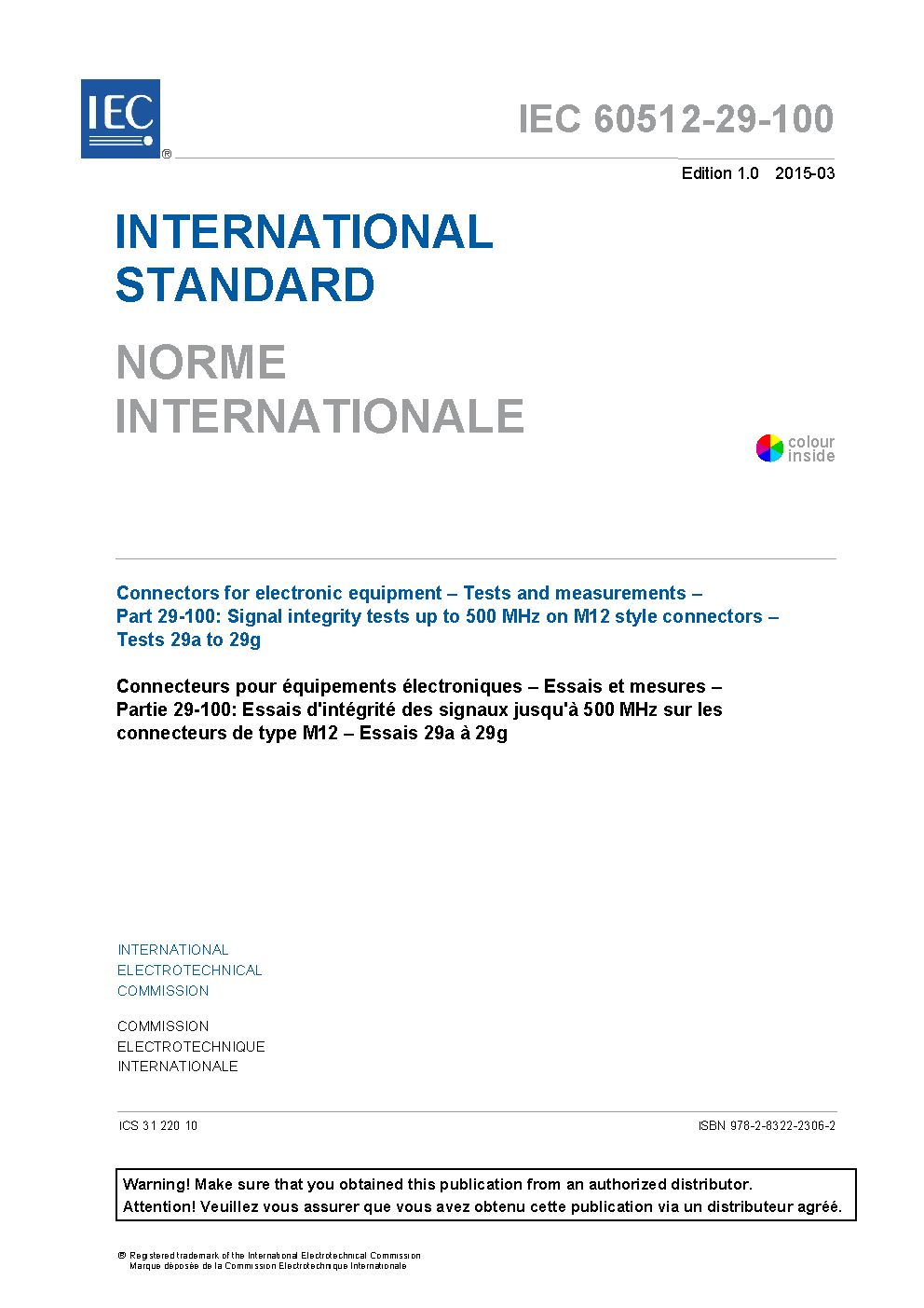 IEC 60512-29-100:2015 specifies the test methods for transmission performance for M12-style connectors up to 500 MHz. It is also suitable for testing lower frequency connectors if they meet the requirements of the detail specifications and of this standard. The test methods provided herein are