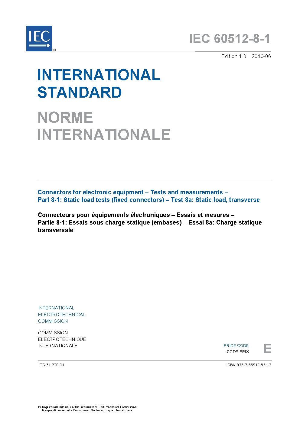 IEC 60512-8-1:2010 when required by the detail specification, is used for testing connectors within the scope of technical committee 48. It may also be used for similar devices when specified in a detail specification. The object of this standard is to detail a standard test method to assess the suitability of a fixed connector for use in applications where it may be subject to transverse stresses.