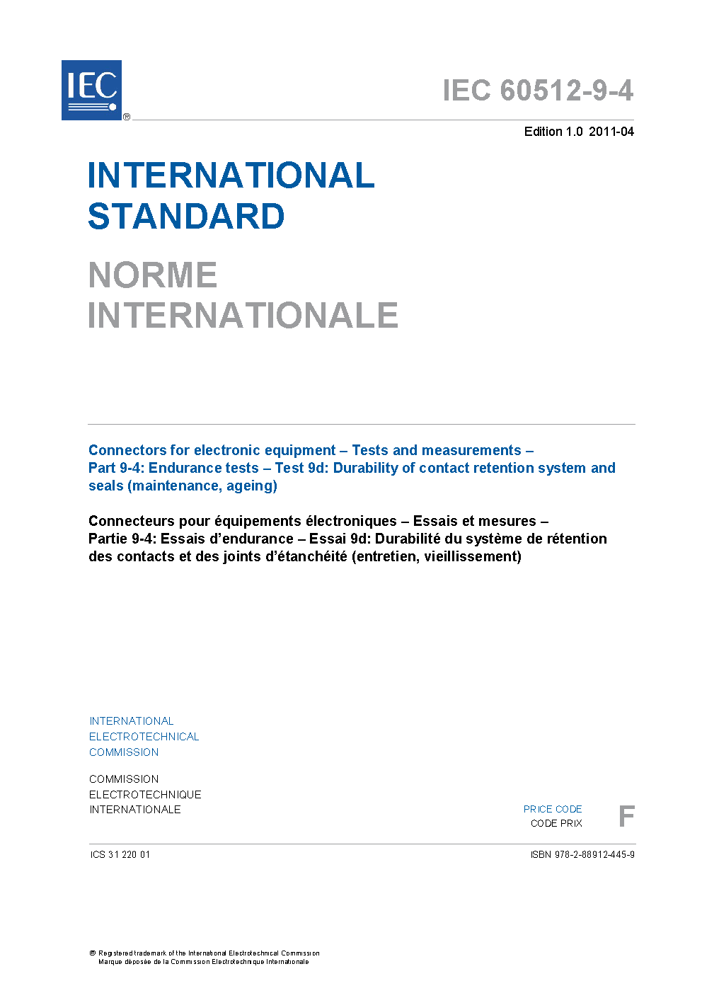 IEC 60512-9-4:2011 Connectors for electronic equipment - Tests and measurements - Part 9-4: Endurance tests - Test 9d: Durability of contact retention system and seals (maintenance, ageing)
