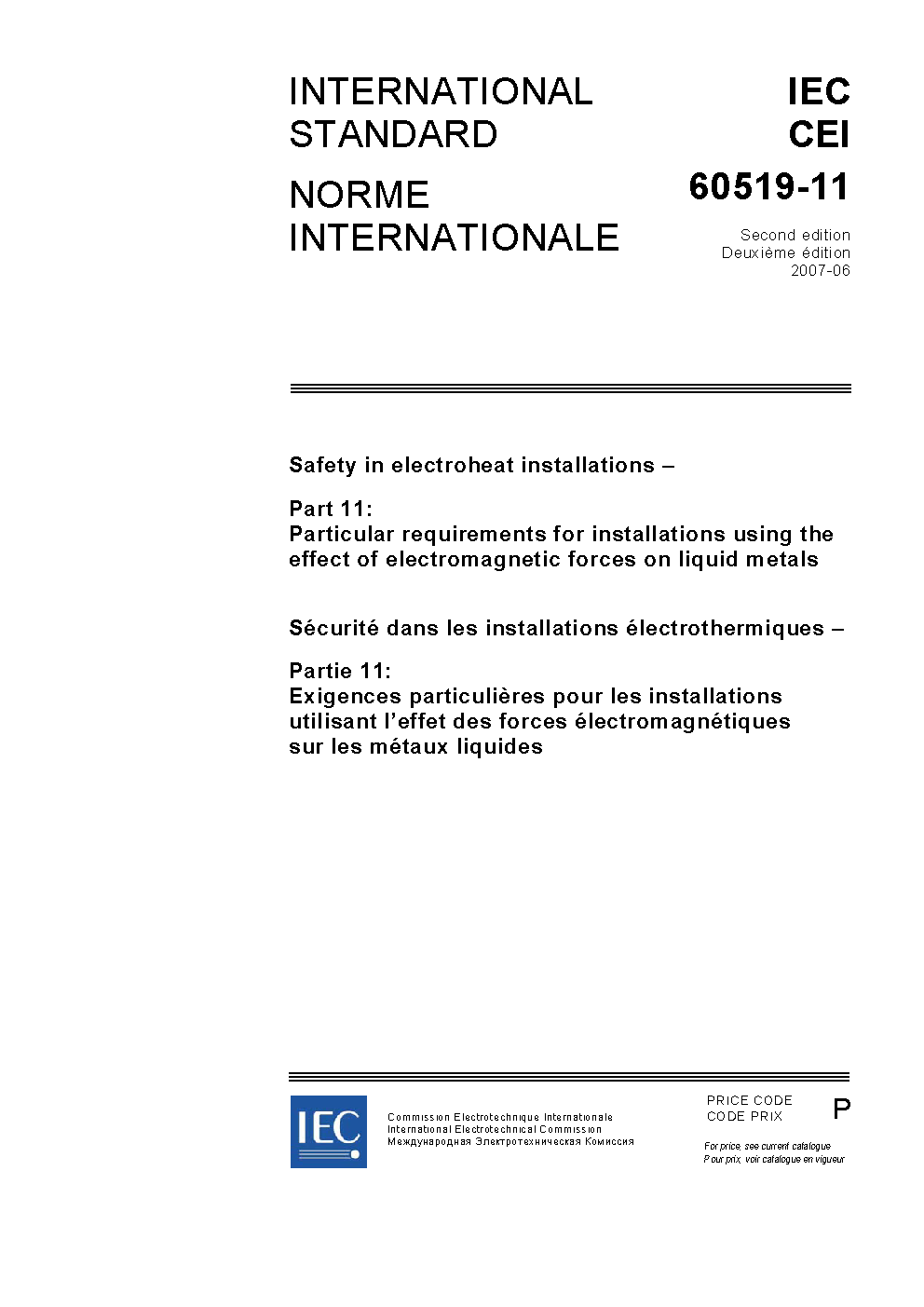 IEC 60519-11:2007 Safety in electroheat installations - Part 11: Particular requirements for installations using the effect of electromagnetic forces on liquid metals