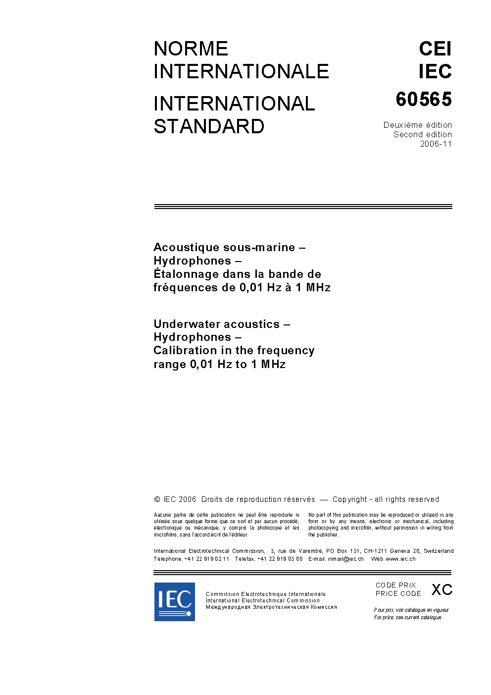 IEC 60565-2:2019 specifies the methods for low frequency pressure calibration of hydrophones at frequencies from 0,01 Hz to several kilohertz depending on calibration method.