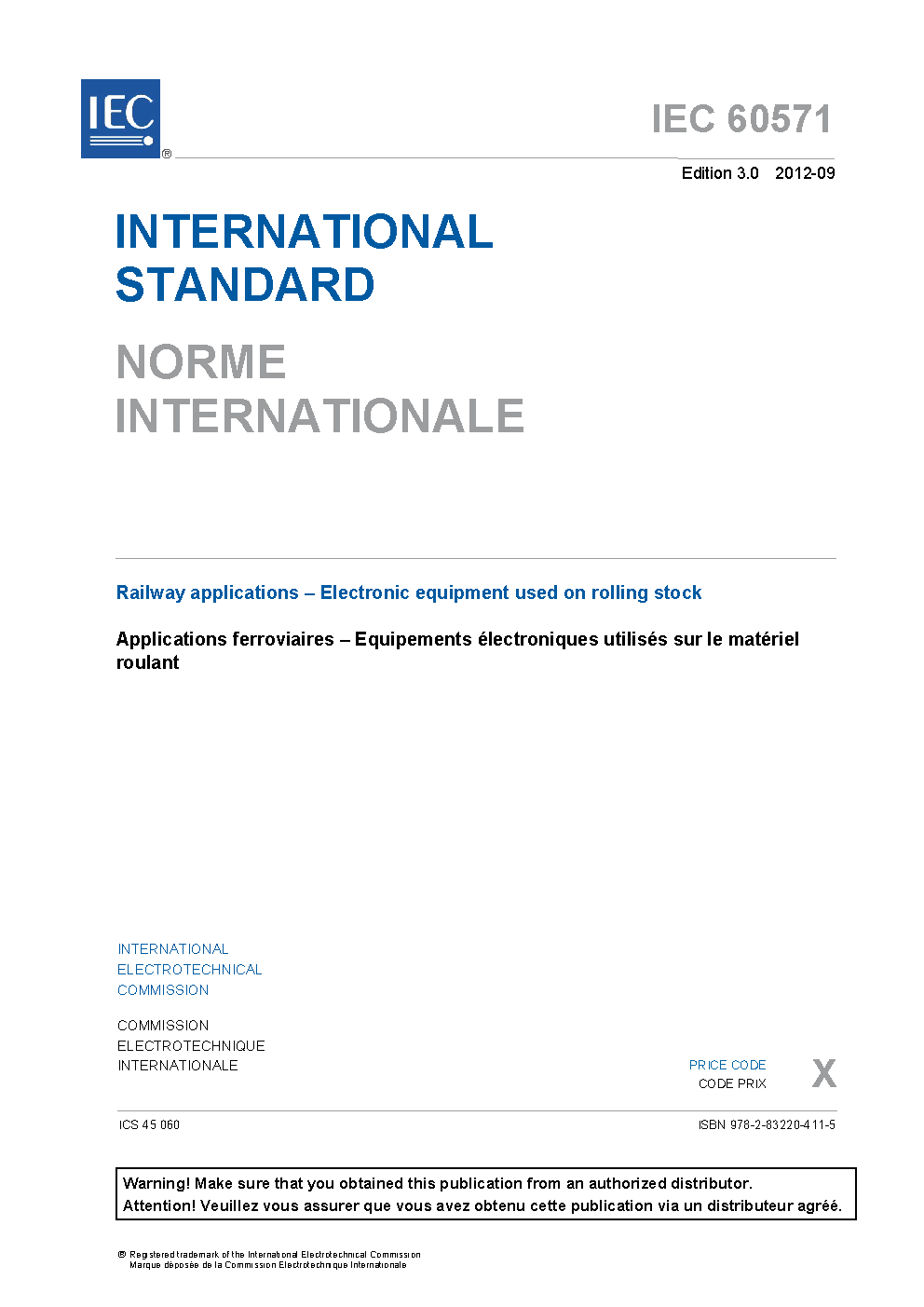 IEC 60571:2012 covers the conditions of operation, design, construction, and testing of electronic equipment, as well as basic hardware and software requirements considered necessary for competent, reliable equipment. Applies to all electronic equipment for control, regulation, protection, supply, etc., installed on rail vehicles and associated with: either the accumulator battery of the vehicle; or a low voltage power supply source with or without a direct connection to the contact system. One of the technical changes with respect to the previous edition consists of the addition of nominal voltages of equipment.