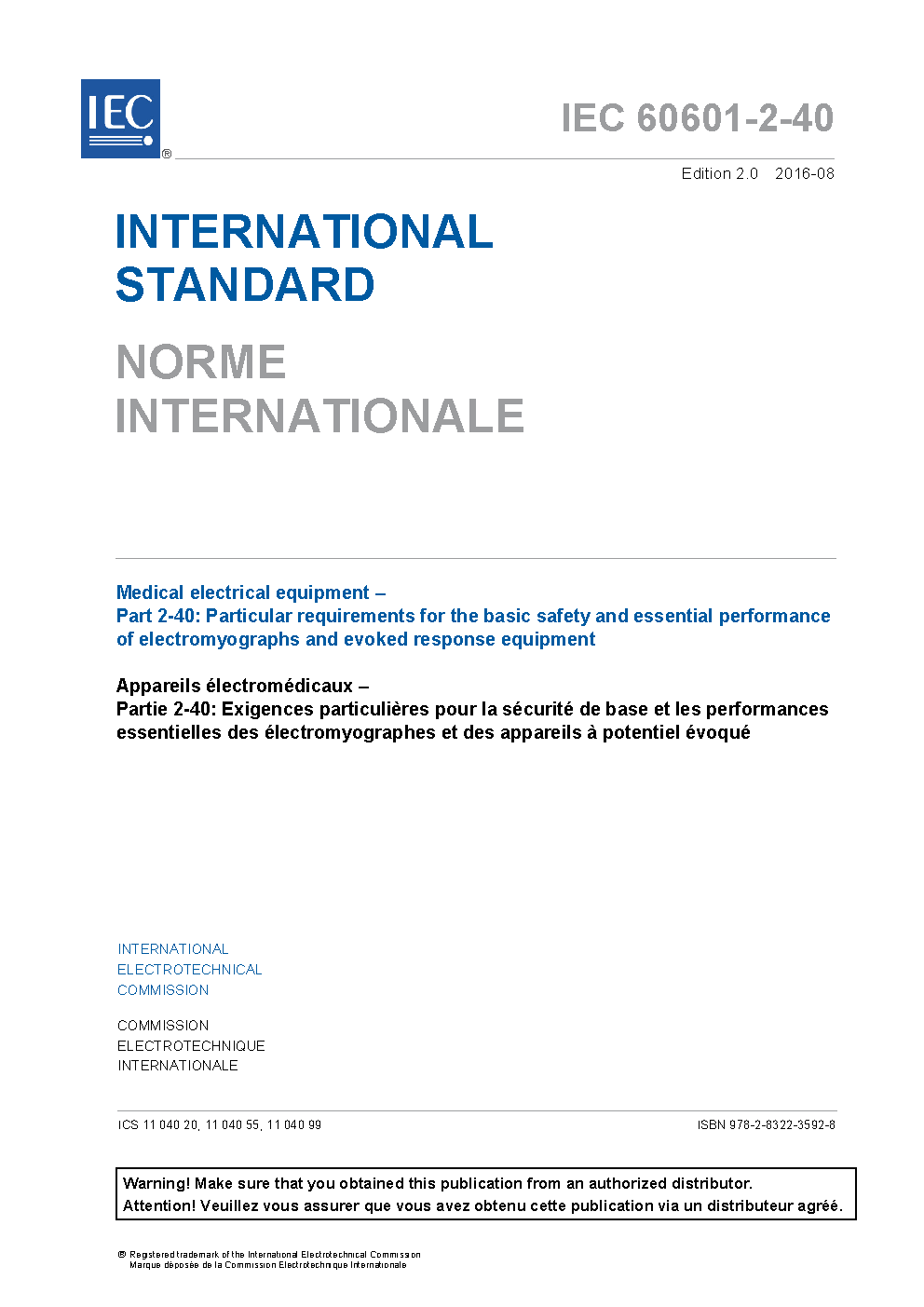 IEC 60601-2-40:2016 Medical electrical equipment - Part 2-40: Particular requirements for the basic safety and essential performance of electromyographs and evoked response equipment
