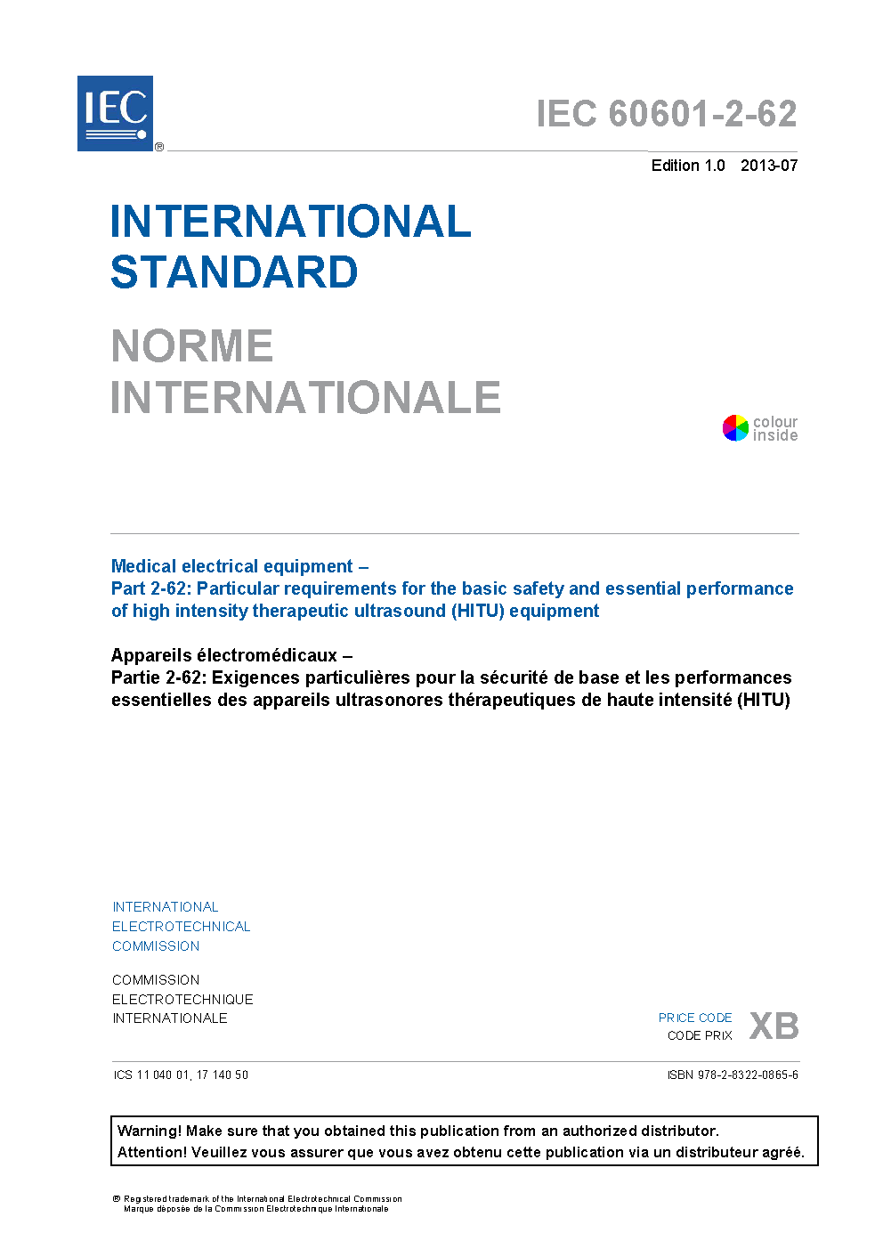 IEC 60601-2-62:2013 Medical electrical equipment - Part 2-62: Particular requirements for the basic safety and essential performance of high intensity therapeutic ultrasound (HITU) equipment