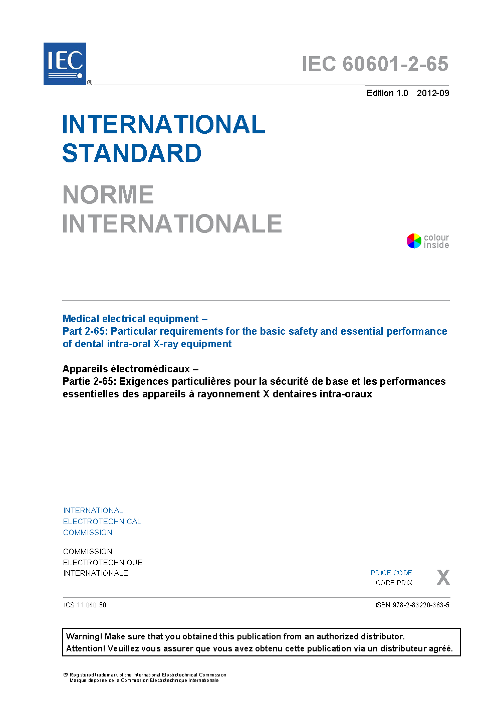 IEC 60601-2-65:2012 Medical electrical equipment - Part 2-65: Particular requirements for the basic safety and essential performance of dental intra-oral X-ray equipment