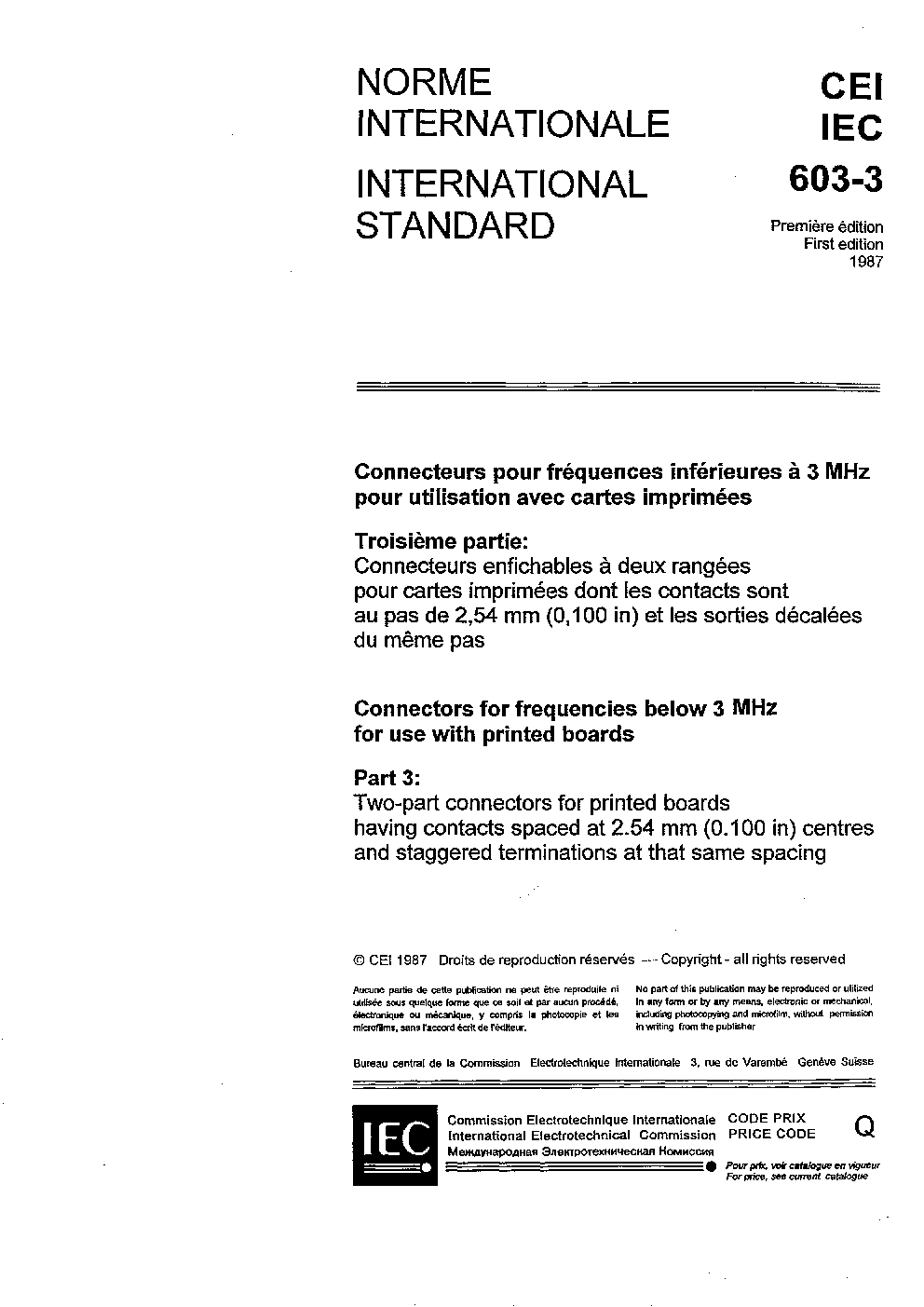 IEC 60603-3:1987 Connectors for frequencies below 3 MHz for use with printed boards - Part 3: Two-part connectors for printed boards having contacts spaced at 2,54 mm (0,100 in) centres and staggered terminations at that same spacing