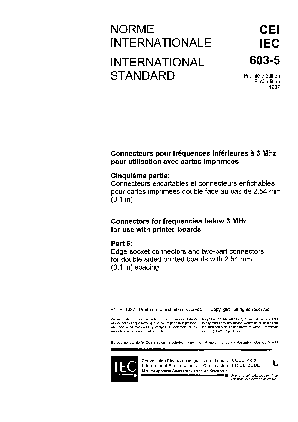 IEC 60603-5:1987 Connectors for frequencies below 3 MHz for use with printed boards - Part 5: Edge-socket connectors and two-part connectors for double-sided printed boards with 2,54 mm (0,1 in) spacing