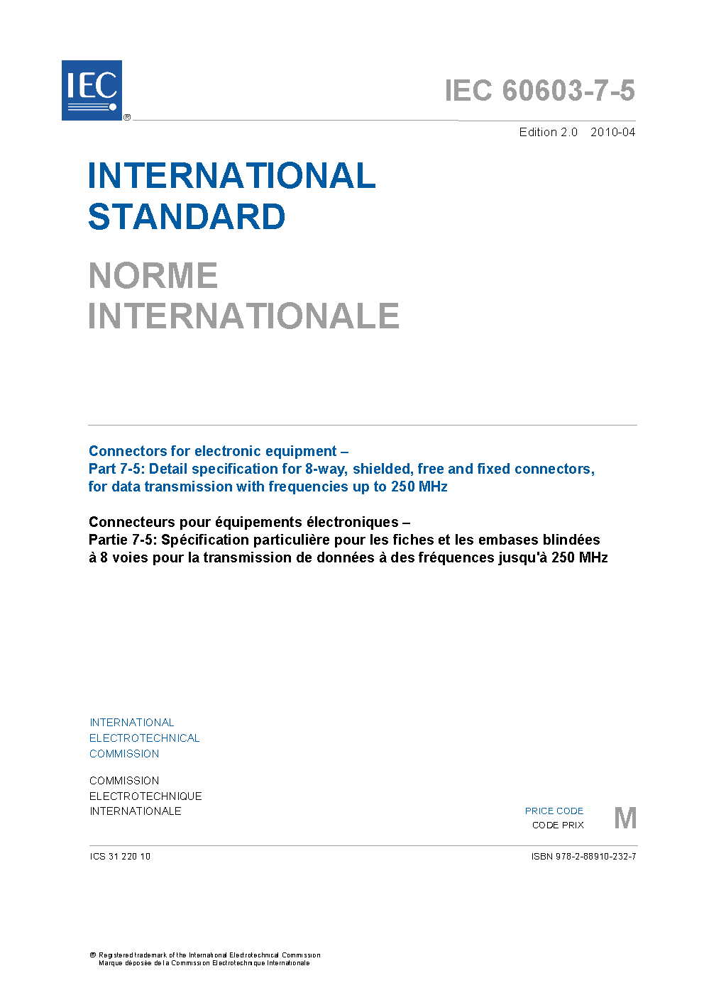 IEC 60603-7-5:2010 covers 8-way, shielded, free and fixed connectors and references dimensional, mechanical, electrical and environmental characteristics and tests in IEC 60603-7 and IEC 60603-7-1, and specifies electrical transmission requirements for frequencies up to 250 MHz. These connectors are typically used as category 6 connectors in class E cabling systems specified in ISO/IEC 11801. These connectors are intermateable and interoperable with other IEC 60603-7 series connectors as defined in Clause 2 of IEC 60603-7. These connectors are backward compatible with other IEC 60603-7 series connectors.