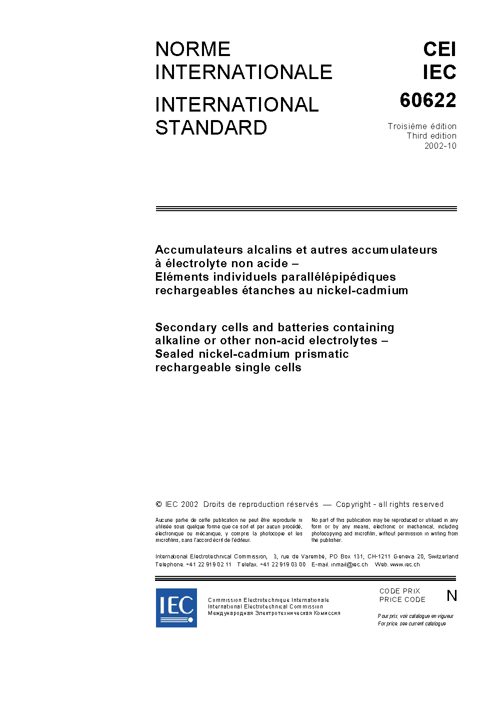 IEC 60622:2002 Secondary cells and batteries containing alkaline or other non-acid electrolytes - Sealed nickel-cadmium prismatic rechargeable single cells
