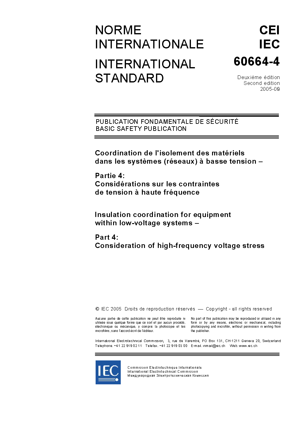 IEC 60664-4:2005 Deals with basic, supplementary and reinforced insulation subjected to high-frequency voltage stress within low-voltage equipment. The dimensioning values directly apply for basic insulation; for reinforced insulation additional requirements apply according to Part 1. It is applicable for the dimensioning of clearances, creepage distances and solid insulation stressed by any type of periodic voltages with a fundamental frequency above 30 kHz and up to 10 MHz. This part of IEC 60664 can only be used together with IEC 60664-1 or with IEC 60664-5 (in this standard called Part 1 or Part 5). By using Part 1 or Part 5 together with this part the frequency limit of Part 1 or Part 5 is extended to frequencies higher than 30 kHz. This part also applies to Part 3 for frequencies greater than 30 kHz and protection of type 1. For type 2 protection this question is under consideration. Applies to equipment for use up to 2 000 m above sea level having a rated voltage up to a.c. 1 000 V. Specifies the requirements for clearances, creepage distances and solid insulation for equipment based upon their performance criteria. lt includes methods of electric testing with respect to insulation coordination. The minimum clearances specified in this part do not apply where ionized gases occur. Special requirements for such situations may be specified at the discretion of the relevant technical committee. This part does not deal with distances