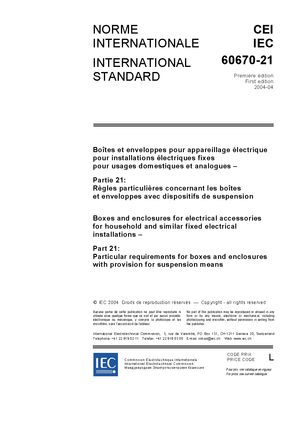 IEC 60670-21:2024 applies to boxes, enclosures and parts of enclosures (hereafter called "boxes" and "enclosures") for electrical accessories with a rated voltage not exceeding 1 000 V AC and 1 500 V DC intended for household or similar fixed electrical installations, either indoors or outdoors. Boxes and enclosures complying with this document are suitable for use at ambient temperatures not normally exceeding +40 °C, but their average over a period of 24 h does not exceed +35 °C, with a lower limit of the ambient air temperature of -5 °C. Other temperatures outside the above range can apply according to the classification of the boxes and the enclosures. This document applies to boxes and enclosures for ceiling and wall mounting with provision for suspension means. This second edition cancels and replaces the first edition published in 2004 and Amendment 1:2016. This edition constitutes a technical revision.
