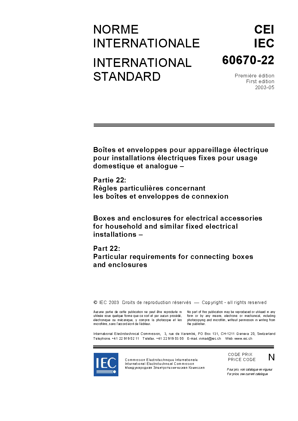 IEC 60670-22:2024 applies to boxes, enclosures and parts of enclosures (hereafter called "boxes" and "enclosures") for electrical accessories with a rated voltage not exceeding 1 000 V AC and 1 500 V DC intended for household or similar fixed electrical installations, either indoors or outdoors. Boxes and enclosures complying with this document are suitable for use at ambient temperatures not normally exceeding +40 °C, but their average over a period of 24 h does not exceed +35 °C, with a lower limit of the ambient air temperature of -5 °C. Other temperatures outside the above range can apply according to the classification of the boxes and the enclosures. This document applies to junction connecting boxes or tapping connecting boxes or both.