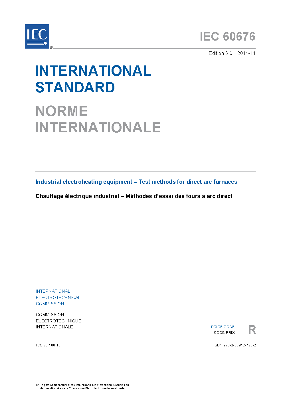 IEC 60676:2011 specifies test procedures, conditions and methods according to which the main parameters and the main operational characteristics of electric arc furnaces (EAF) operated either with alternating current (EAFac) or with direct current (EAFdc) with a capacity above 500 kg/heat are established. This third edition cancels and replaces the previous edition published in 2002 and constitutes a technical revision. Significant technical changes with respect to the previous edition are as follows: