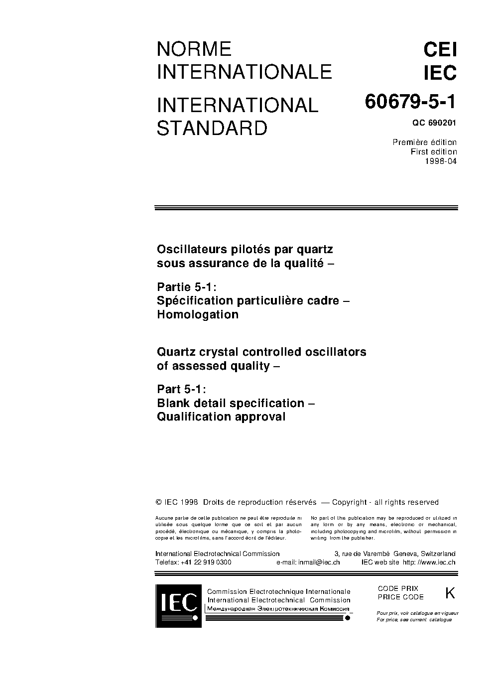 IEC 60679-5-1:1998 Quartz crystal controlled oscillators of assessed quality - Part 5-1: Blank detail specification - Qualification approval