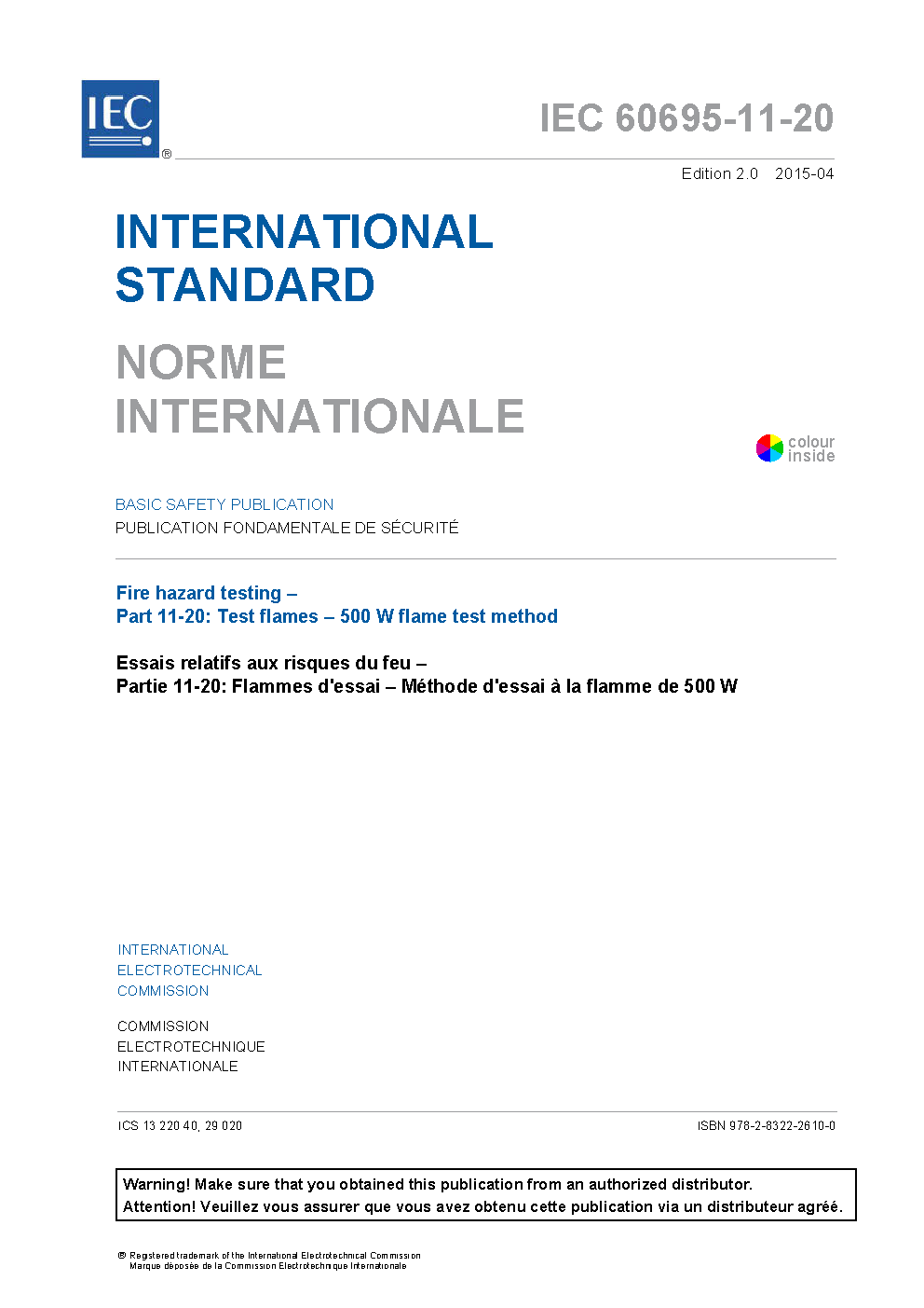 IEC 60695-11-20:2015 Fire hazard testing - Part 11-20: Test flames - 500 W flame test method