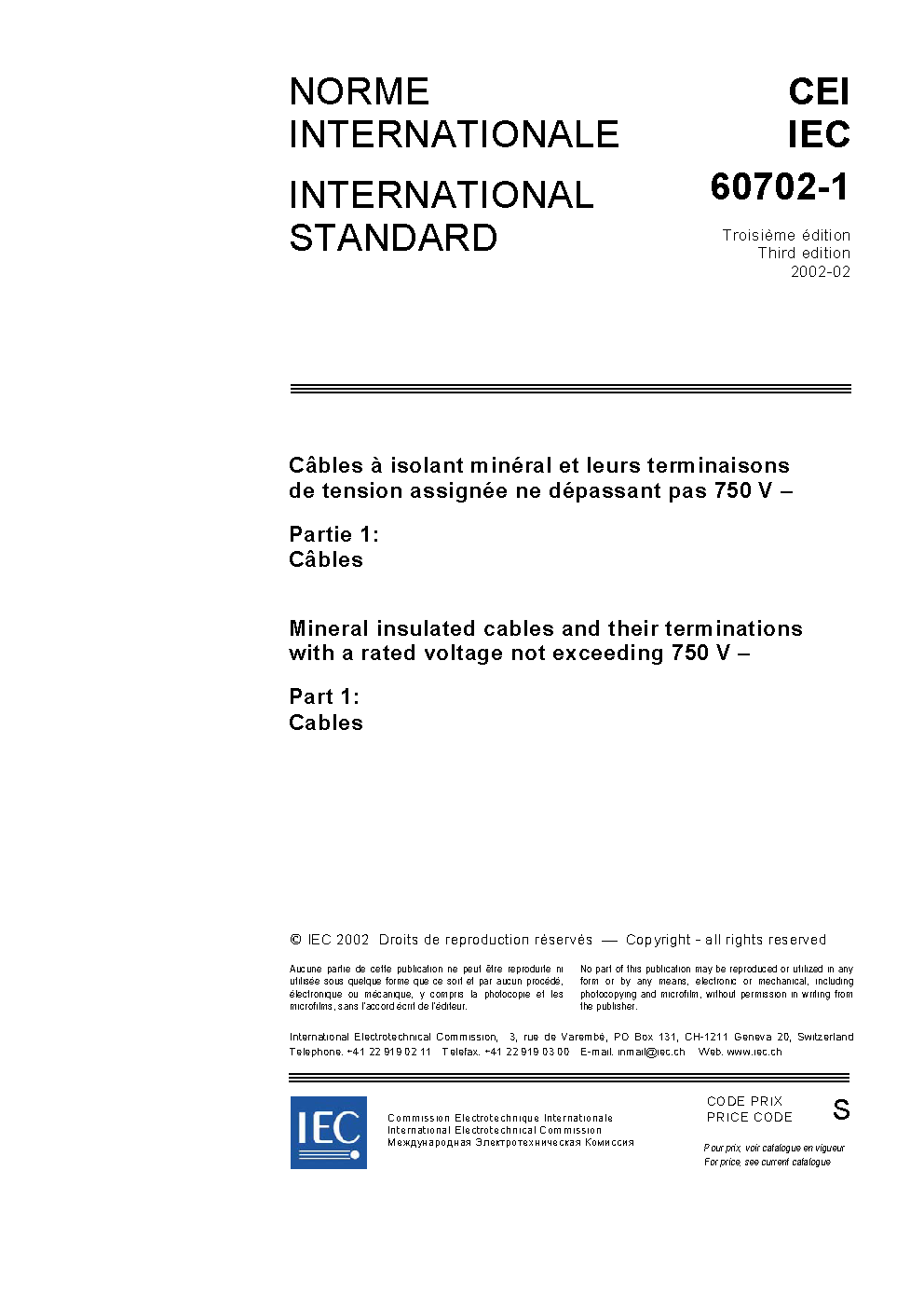IEC 60702-1:2002 Mineral insulated cables and their terminations with a rated voltage not exceeding 750 V - Part 1: Cables