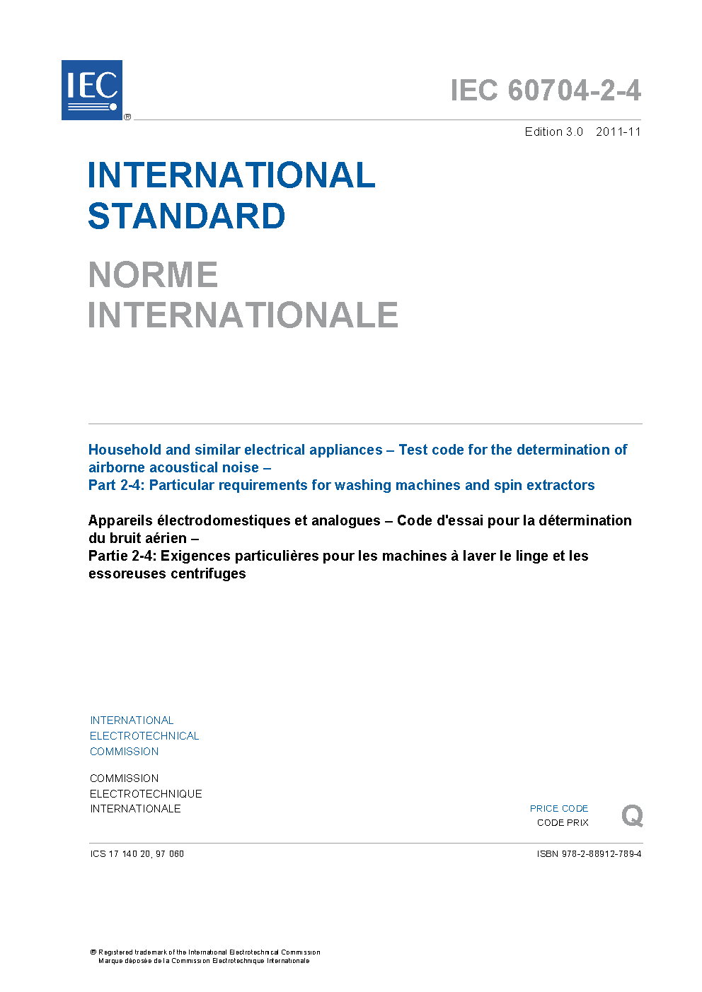 IEC 60704-2-4:2011 These particular requirements apply to single unit electrical washing machines and the washing and spinning function of combined appliances for household and similar use and to spin extractors for household and similar use. This third edition cancels and replaces the second edition (2001). Main changes are: