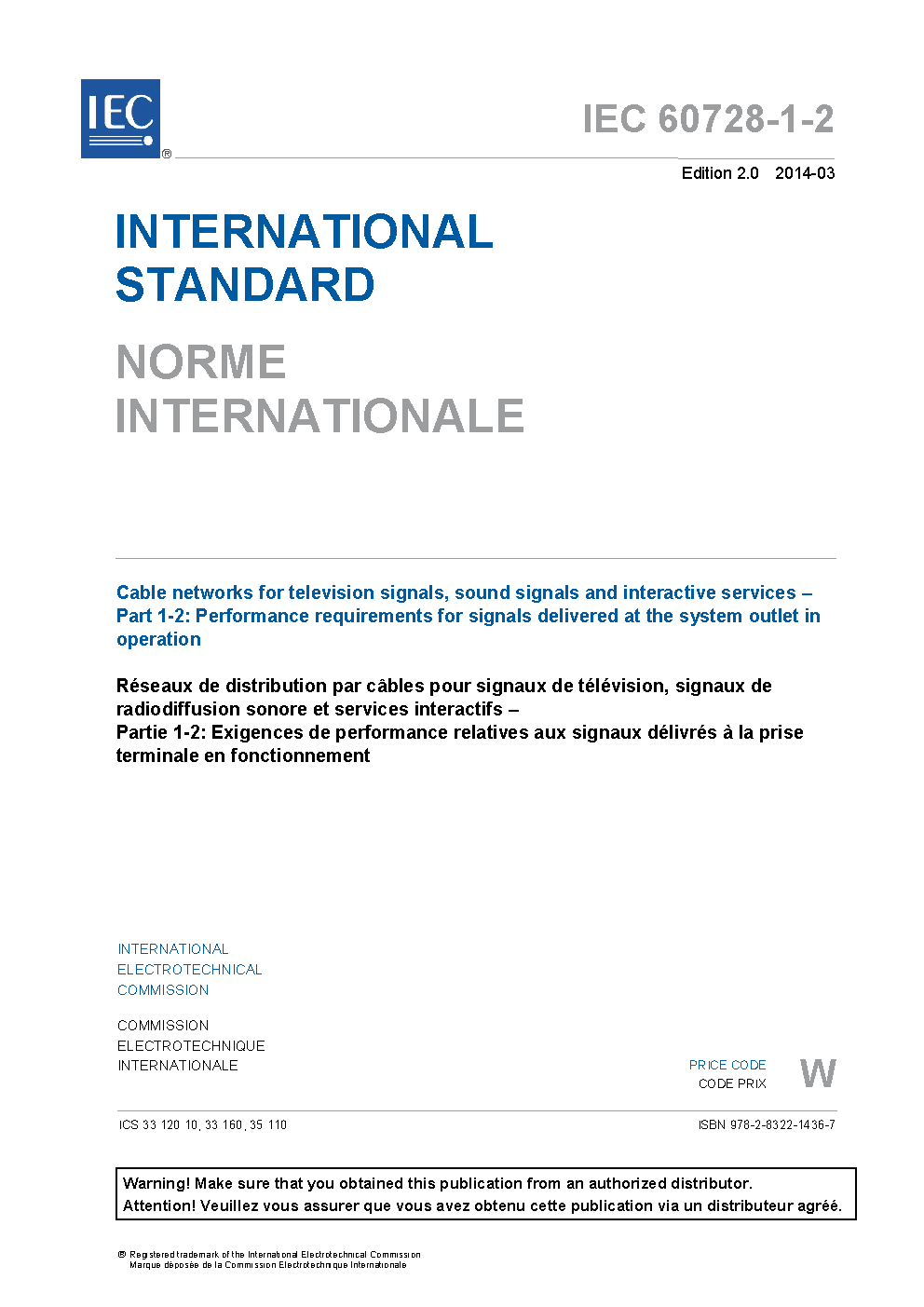 IEC 60728-1-2:2014 Cable networks for television signals, sound signals and interactive services - Part 1-2: Performance requirements for signals delivered at the system outlet in operation