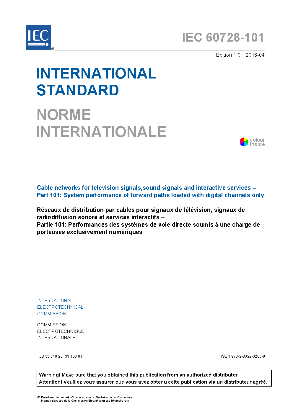 IEC 60728-101:2016 Cable networks for television signals, sound signals and interactive services - Part 101: System performance of forward paths loaded with digital channels only