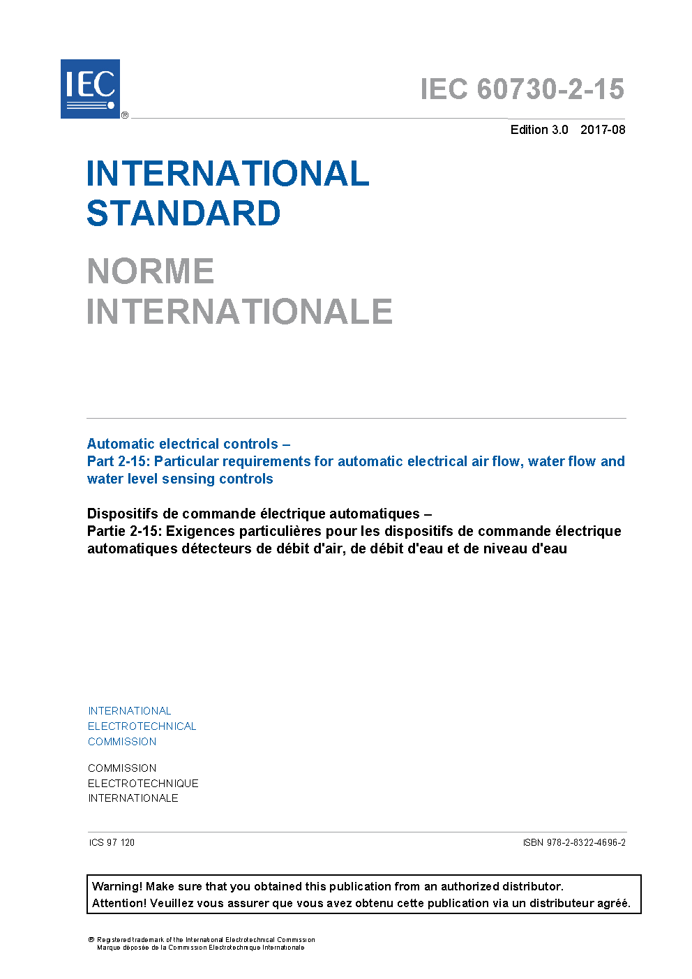 IEC 60730-2-15:2017 Automatic electrical controls - Part 2-15: Particular requirements for automatic electrical air flow, water flow and water level sensing controls