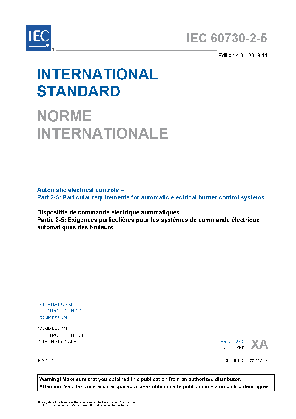 IEC 60730-2-5:2013 applies to automatic electrical burner control systems for the automatic control of burners for oil, gas, coal or other combustibles for household and similar use including heating, air conditioning and similar use. This part 2-5 is applicable to a complete burner control system and to a separate programming unit. This part 2-5 is also applicable to a separate electronic high-voltage ignition source and to a separate flame detector. Separate ignition devices (electrodes, pilot burners, etc.) are not covered by this part 2-5 unless they are submitted as part of a burner control system. Requirements for separate ignition transformers are contained in IEC 60989. Systems utilizing thermoelectric flame supervision are not covered by this part 2-5. This part 2-5 applies to the inherent safety, to the manufacturer's declared operating values, operating times and operating sequences where such are associated with burner safety and to the testing of automatic electrical burner control systems used in, on, or in association with, burners. It was established on the basis of the fourth edition (2010) of that publication. Consideration may be given to future editions of, or amendments to, IEC 60730-1. The title of IEC 60730-2-5 Ed4.0 has been updated to the title of IEC 60730-1 Ed5.0. However, IEC 60730-2-5 Ed4.0 has not been updated in accordance with the technical requirements in IEC 60730-1 Ed5.0. This part 2-5 supplements or modifies the corresponding clauses in IEC 60730-1 so as to convert that publication into the IEC standard: Safety requirements for automatic electrical burner control systems. Key words: Automatic control, Burner control