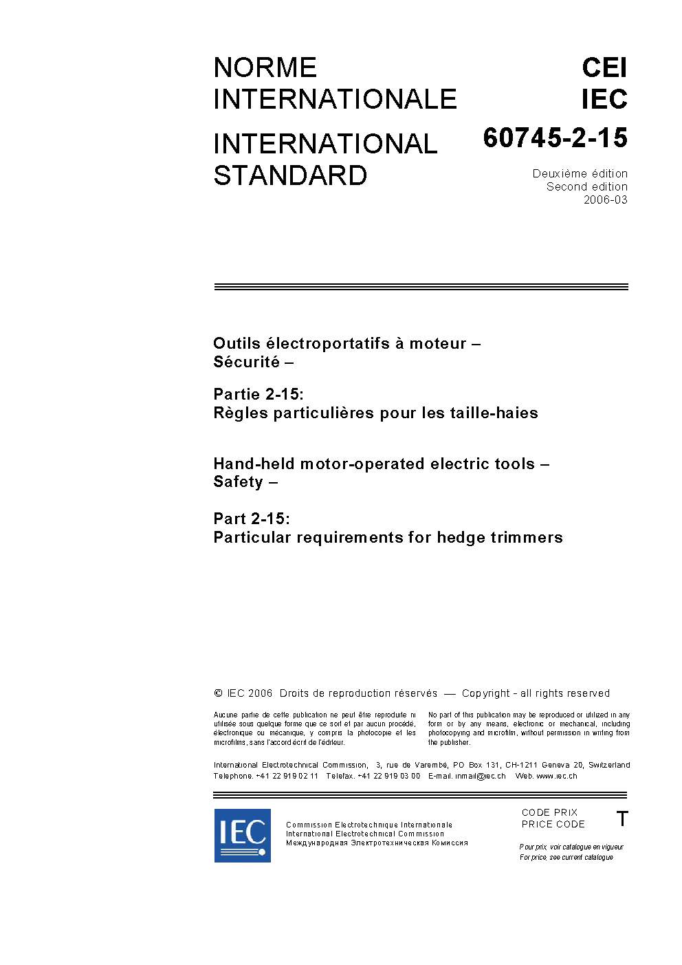 IEC 60745-2-15:2006 Hand-held motor-operated electric tools - Safety - Part 2-15: Particular requirements for hedge trimmers