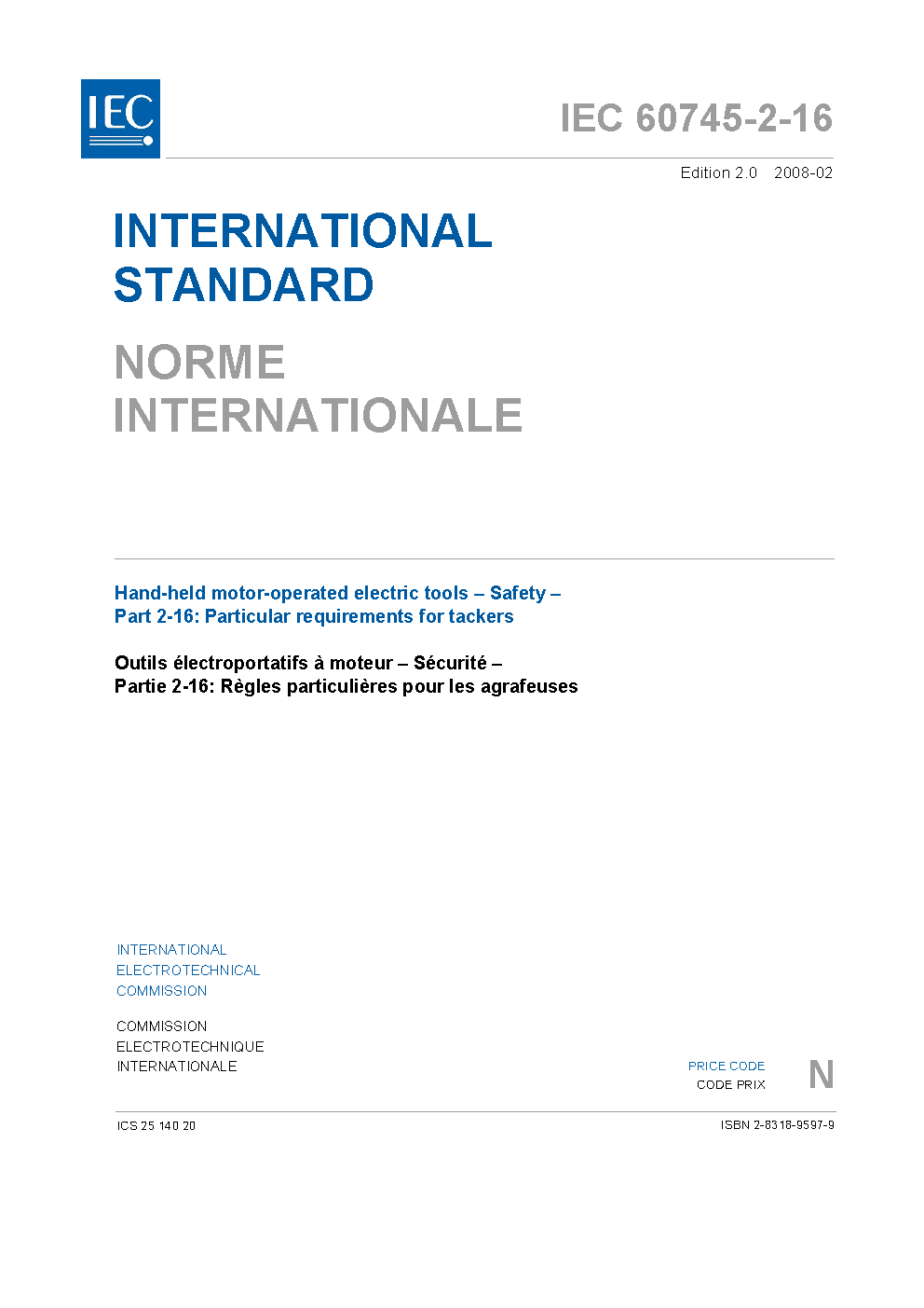 IEC 60745-2-16:2008 Hand-held motor-operated electric tools - Safety - Part 2-16: Particular requirements for tackers