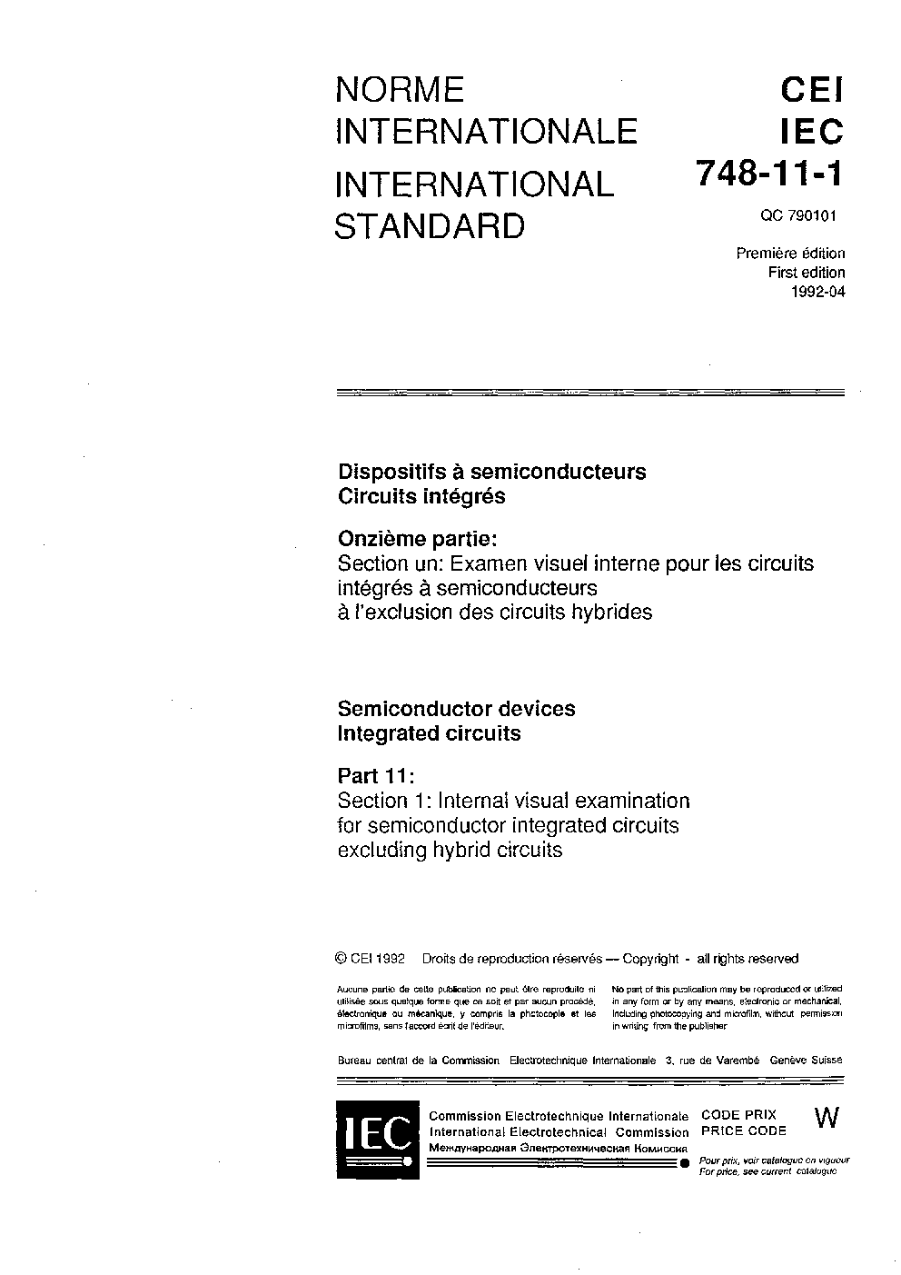 IEC 60748-11-1:1992 Semiconductor devices - Integrated circuits - Part 11-1: Internal visual examination for semiconductor integrated circuits excluding hybrid circuits